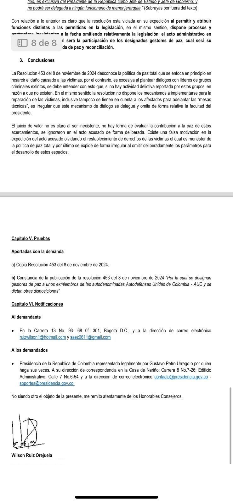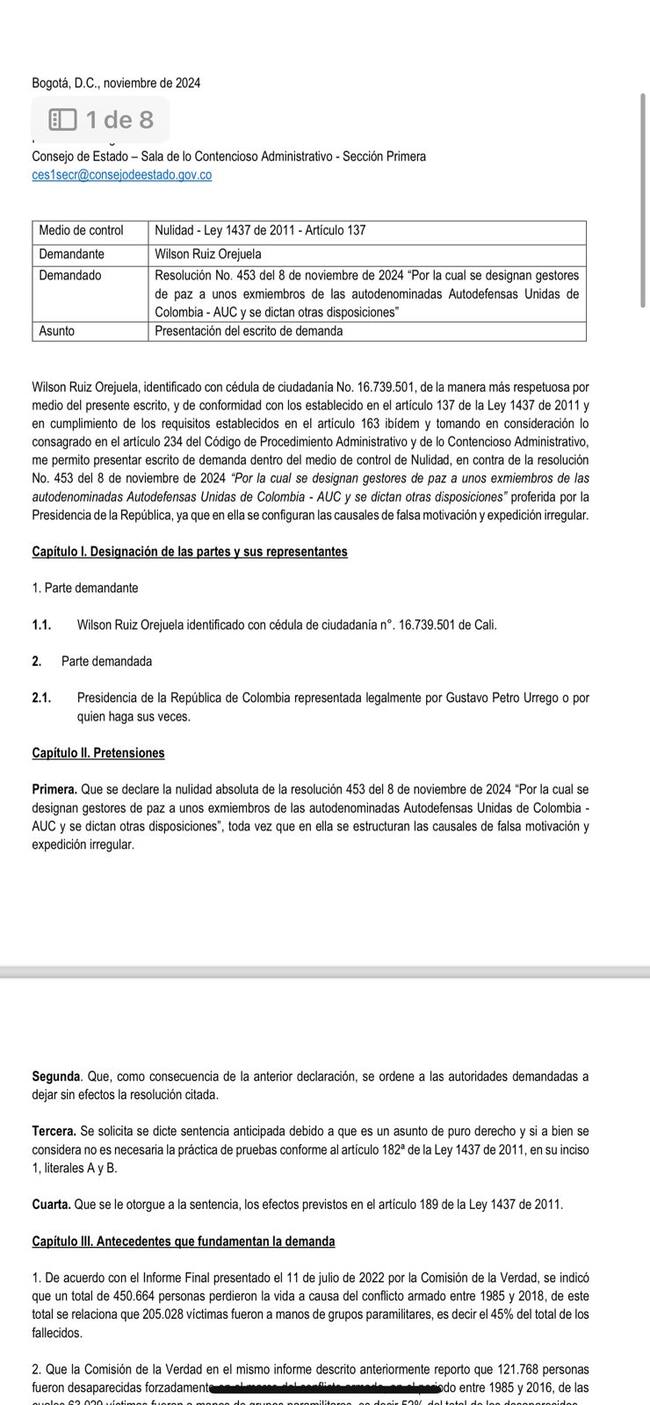 El exministro de Justicia Wilson Ruiz Orejuela presentó una demanda ante el Consejo de Estado en contra de la resolución 453 del 8 de noviembre de 2024, expedida por la Presidencia de la República, que designa como gestores de paz a varios exmiembros de las extintas Autodefensas Unidas de Colombia (AUC).