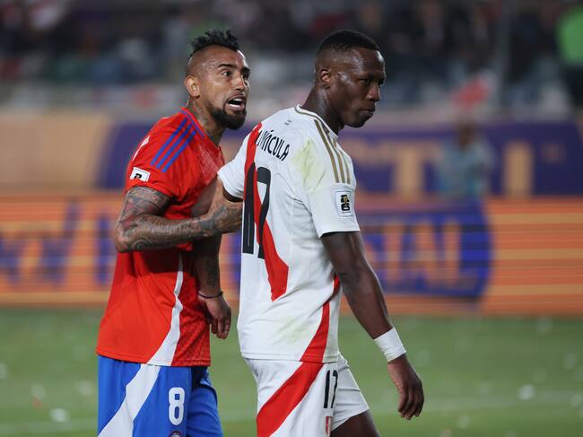 AMDEP9983. LIMA (PERÚ), 15/11/2024.- Luis Advíncula (d) de Perú reacciona con Arturo Vidal de Chile este viernes, durante un partido de las eliminatorias sudamericanas al Mundial de Fútbol 2026, entre Perú y Chile en el Estadio Nacional, en Lima (Perú). EFE/ Germán Falcón / Germán Falcón (EFE)