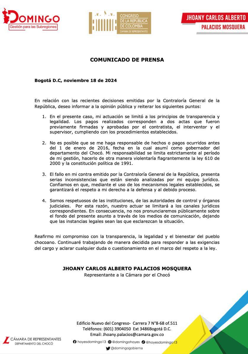 A través de un comunicado, el representante a la Cámara por el Chocó, Jhoany Carlos Alberto Palacios Mosquera, ‘Domingo’, se pronunció, tras la denuncia publicada por W Radio en la que se reveló que, pese a dos inhabilidades de 5 años, el congresista sigue ocupando una curul.