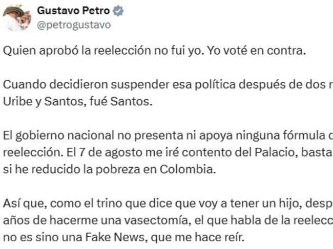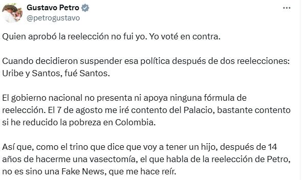 “Así que, como el trino que dice que voy a tener un hijo después de 14 años de hacerme una vasectomía, el que habla de la reelección de Petro no es sino una fake news, que me hace reír”, puntualizó.