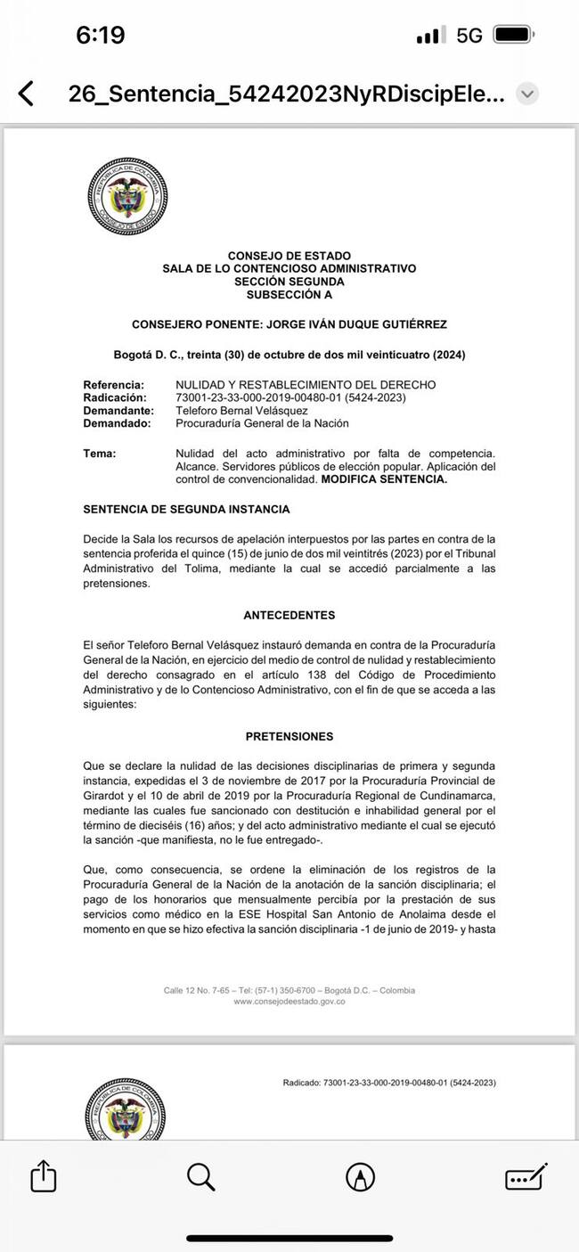 La decisión la tomó la subseccion A y declaró la nulidad de la sanción de destitución e inhabilidad general por 16 años impuesta por la Procuraduría General de la Nación a Teléforo Bernal Velásquez, quien fue alcalde de Flandes, Tolima, durante el período 2012-2015