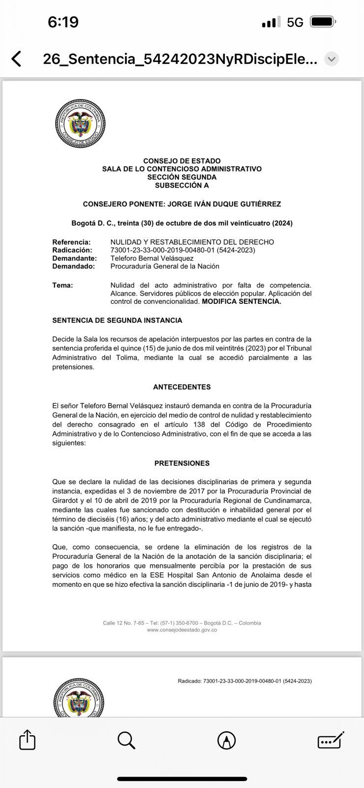 La decisión la tomó la subseccion A y declaró la nulidad de la sanción de destitución e inhabilidad general por 16 años impuesta por la Procuraduría General de la Nación a Teléforo Bernal Velásquez, quien fue alcalde de Flandes, Tolima, durante el período 2012-2015