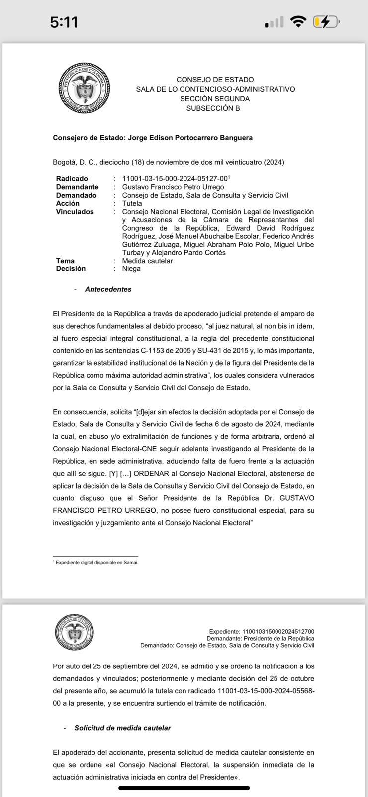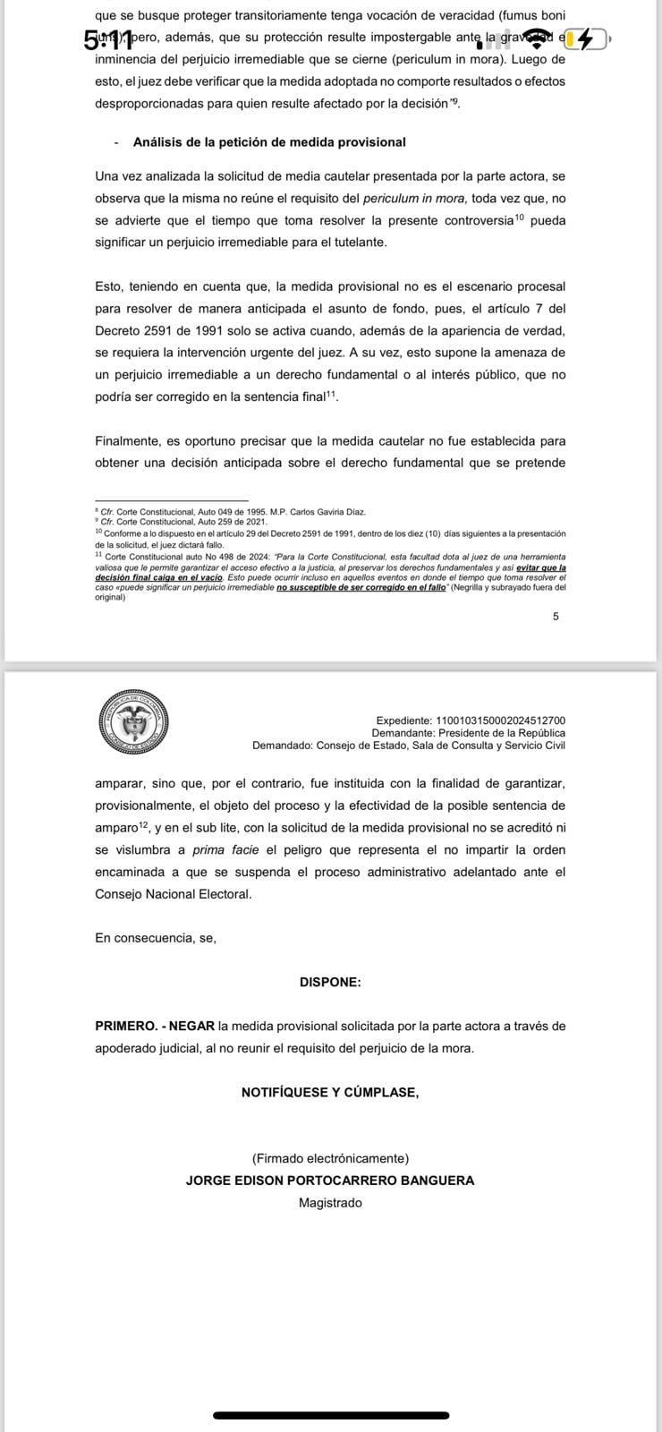 Sin embargo, el magistrado Portocarrero Banguera negó la medida cautelar al considerar que no se cumplía con el requisito de la existencia de un riesgo probable de que el trámite normal del proceso pueda causar un perjuicio irremediable. Según el Consejo de Estado, “la medida cautelar no puede usarse para resolver de manera anticipada el fondo de la controversia, y en este caso no se evidenció que el tiempo necesario para decidir la tutela implique un daño irreparable para el presidente”.