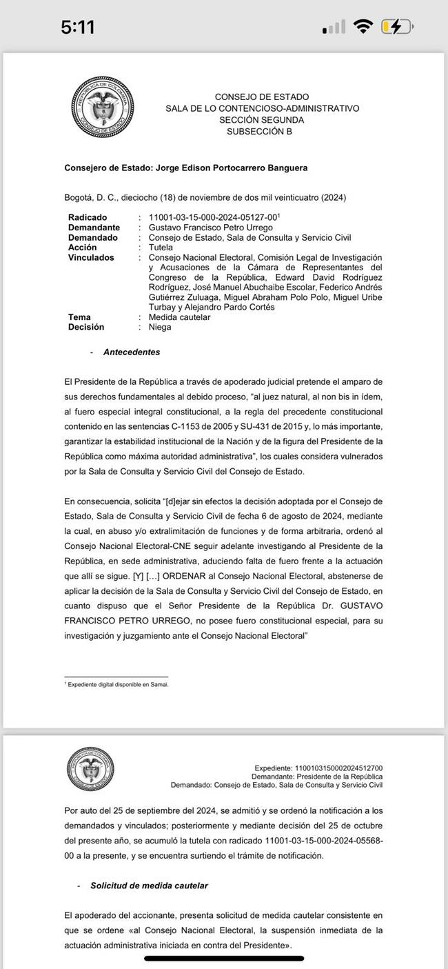 Con ponencia del magistrado Jorge Edison Portocarrero Banguera, el Consejo de Estado negó la solicitud de medida cautelar presentada por el presidente Gustavo Petro en medio de la acción de tutela con la que busca que se amparen sus derechos fundamentales, presuntamente, vulnerados por la Sala de Consulta y Servicio Civil de la corporación, que determinó que el Consejo Nacional Electoral es el competente para investigar la campaña Petro presidente.