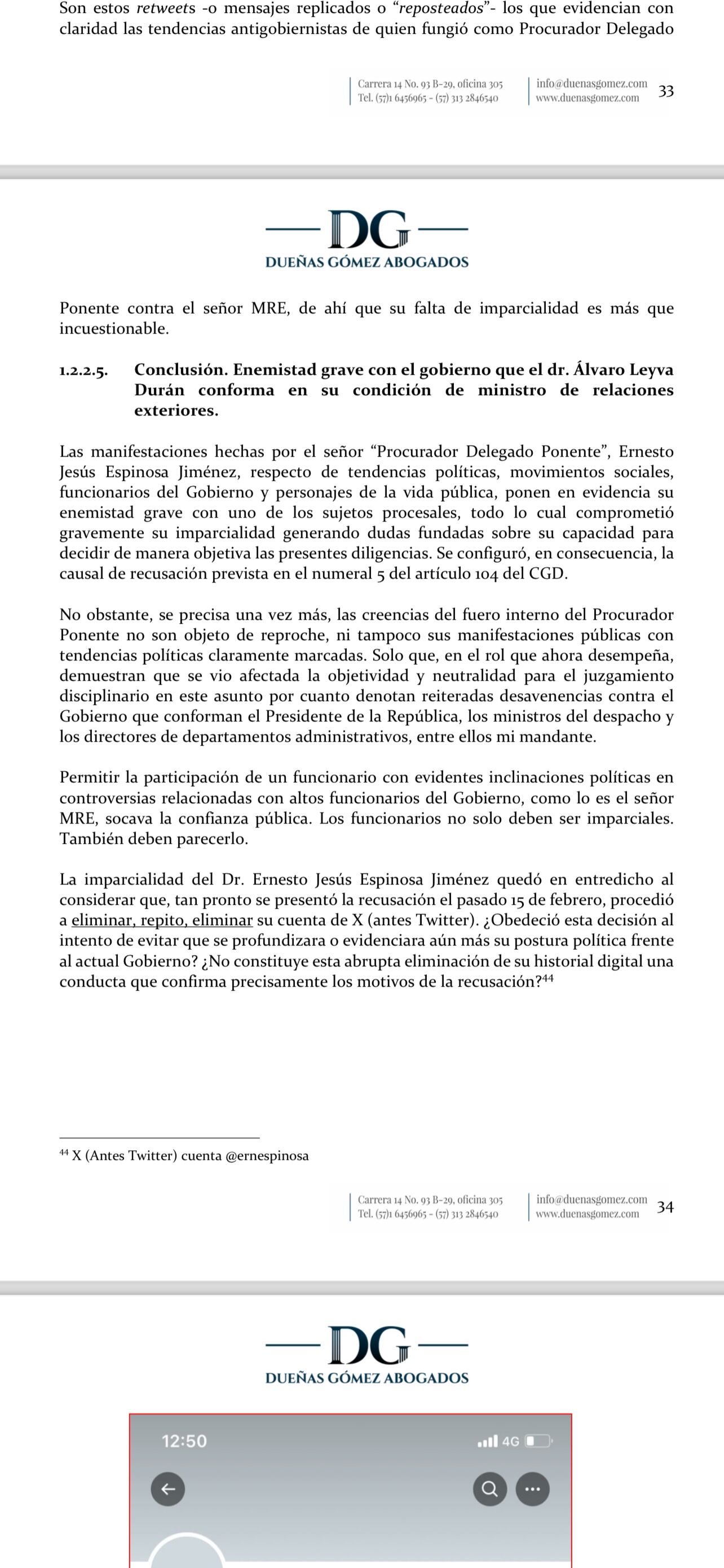 La defensa de Álvaro Leyva Durán argumentó que el procurador delegado ponente, Espinosa Jiménez, incurrió en falta de imparcialidad debido a sus manifestaciones públicas y posiciones políticas que evidencian una enemistad grave con el Gobierno que Leyva integra como canciller.