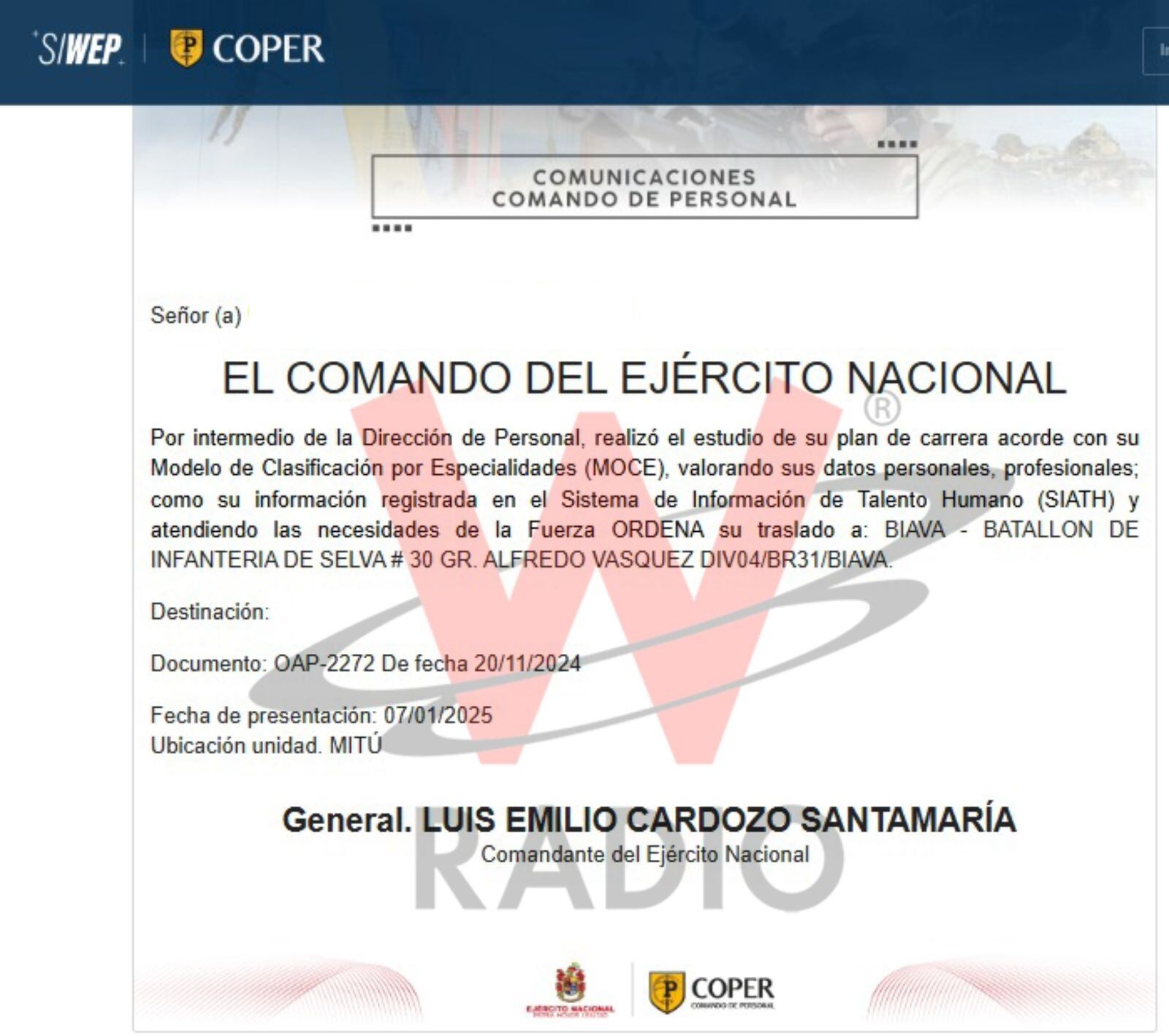 En el documento que está en poder de La W, se lee: “por intermedio de la Dirección de Personal, realizó el estudio de su plan de carrera acorde con su Modelo de Clasificación por Especialidades (MOCE), valorando sus datos personales, profesionales; como su información registrada en el Sistema de Información de Talento Humano (SIATH) y atendiendo las necesidades de la Fuerza ordena su traslado a: Biava- Batallón de Infantería de Selva #30 Gr. Alfredo Vásquez”.