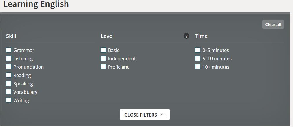 Inicialmente, usted puede escoger, por medio de filtros, la habilidad que desee aprender o reforzar. Por ejemplo, gramática, listening, pronunciación, escritura, speaking, vocabulario, entre otros.