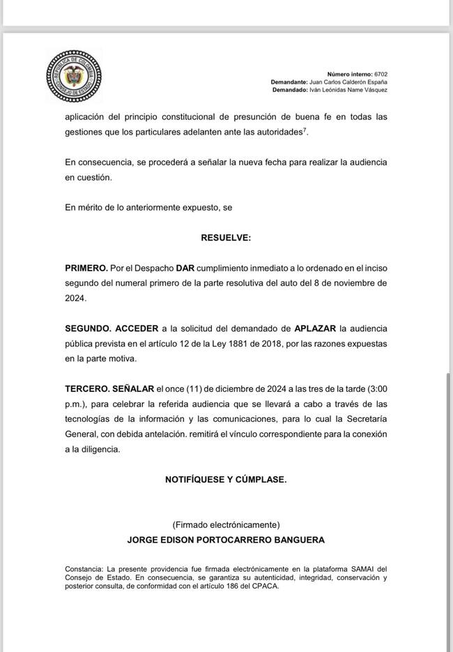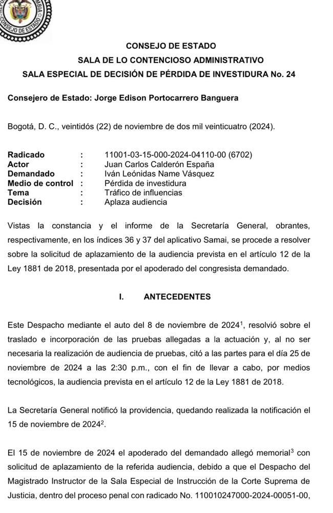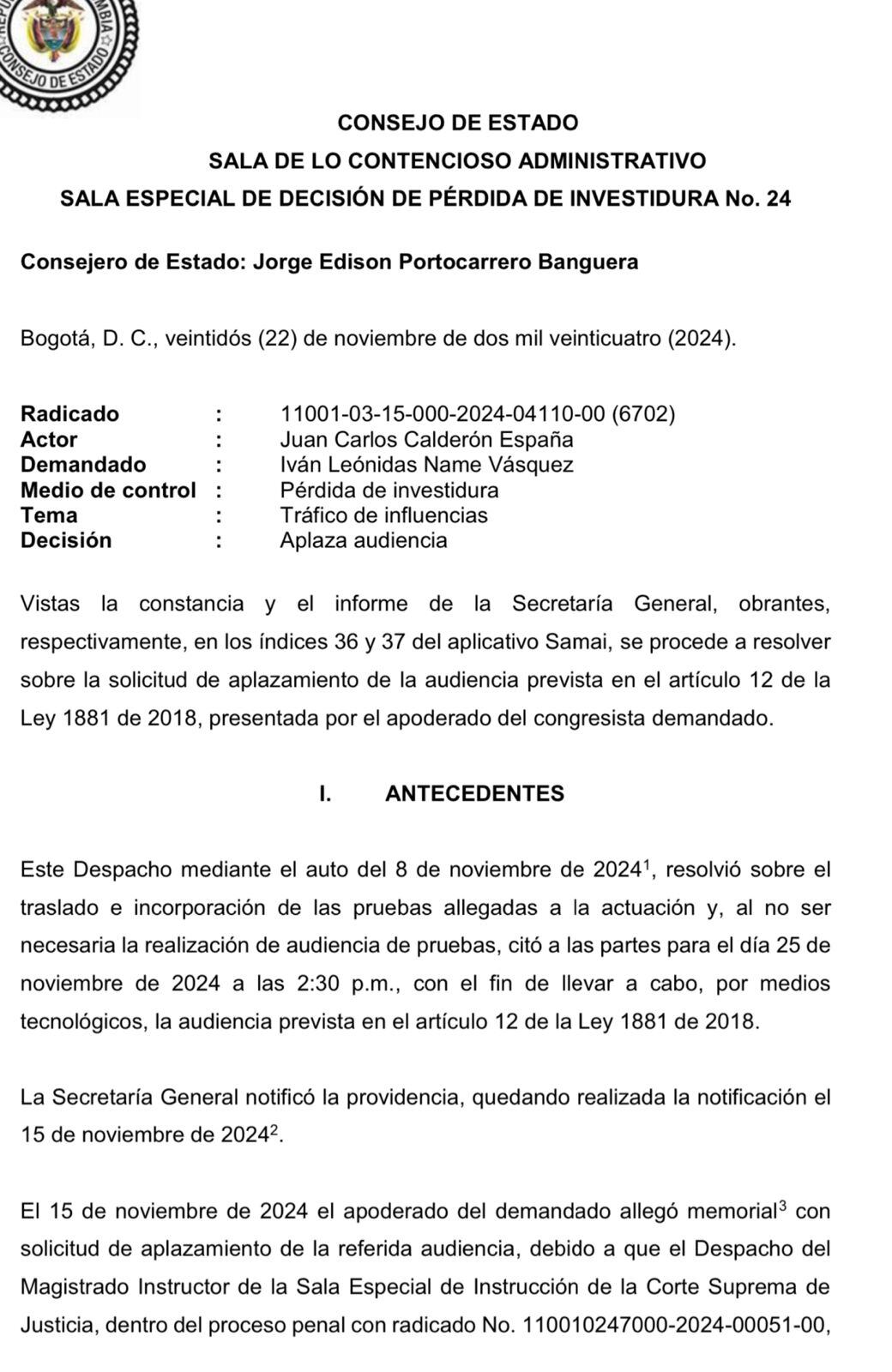 El Consejo de Estado aplazó para el próximo 11 de diciembre, a las 3:00 p.m., la audiencia pública de pérdida de investidura contra el congresista y expresidente del Senado, Iván Name Vásquez. La diligencia, que inicialmente estaba programada para este 25 de noviembre, fue reprogramada tras la solicitud de los abogados de Name, quienes argumentaron un cruce de horarios con otra obligación judicial.