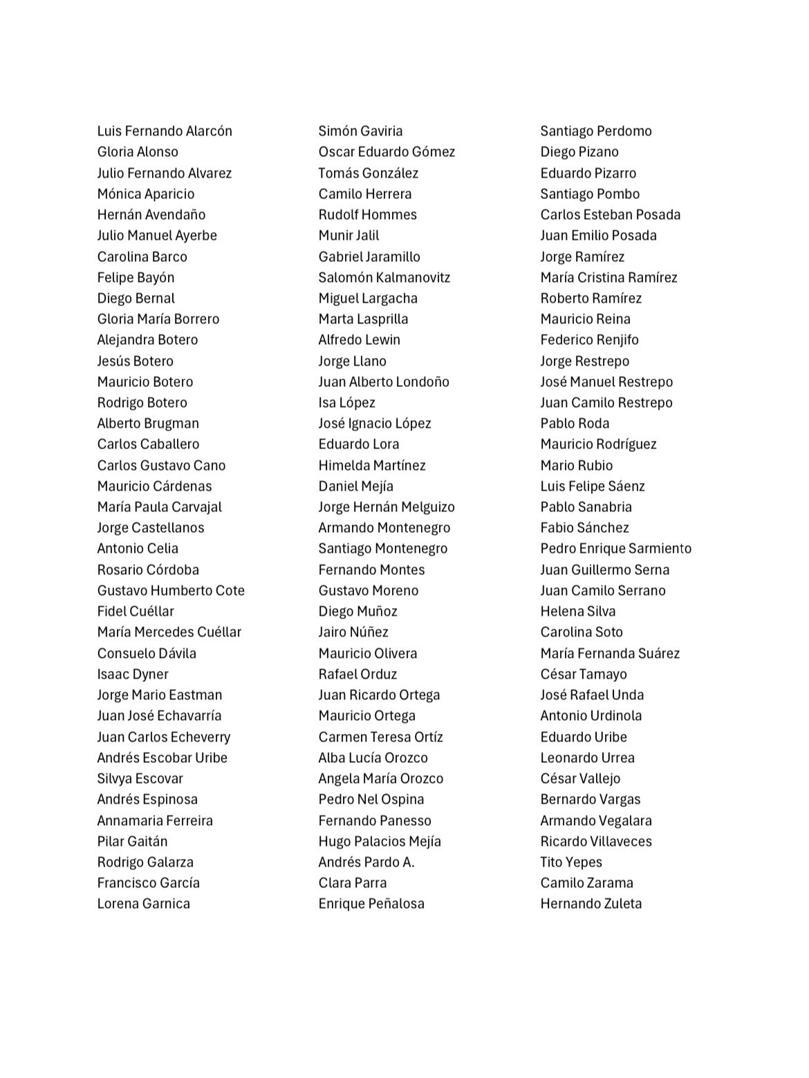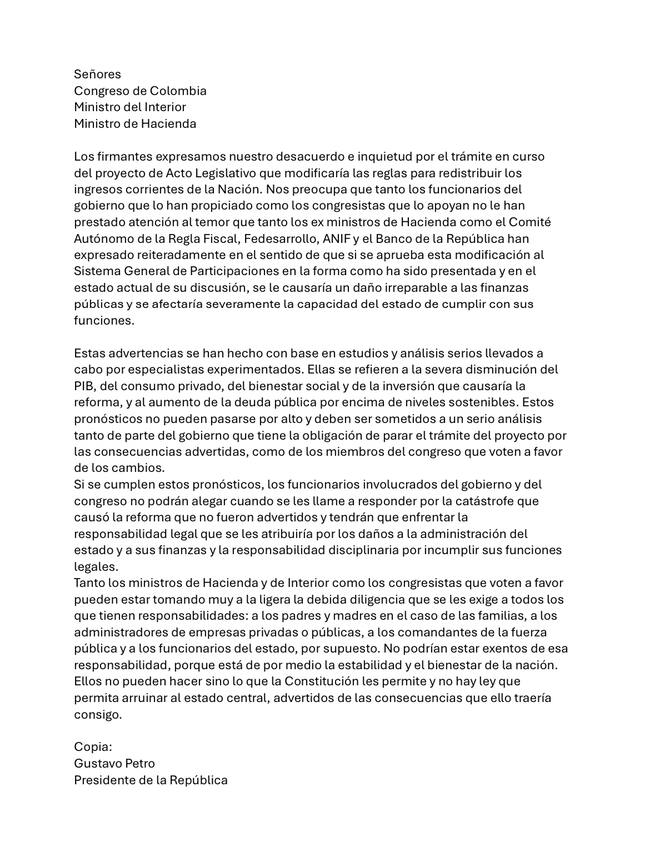 Entre los firmantes de la misiva están José Manuel Restrepo, Juan Carlos Echeverry, Rudolf Hommes, Carolina Barco, Alejandra Botero, María Mercedes Cuéllar, entre otros.