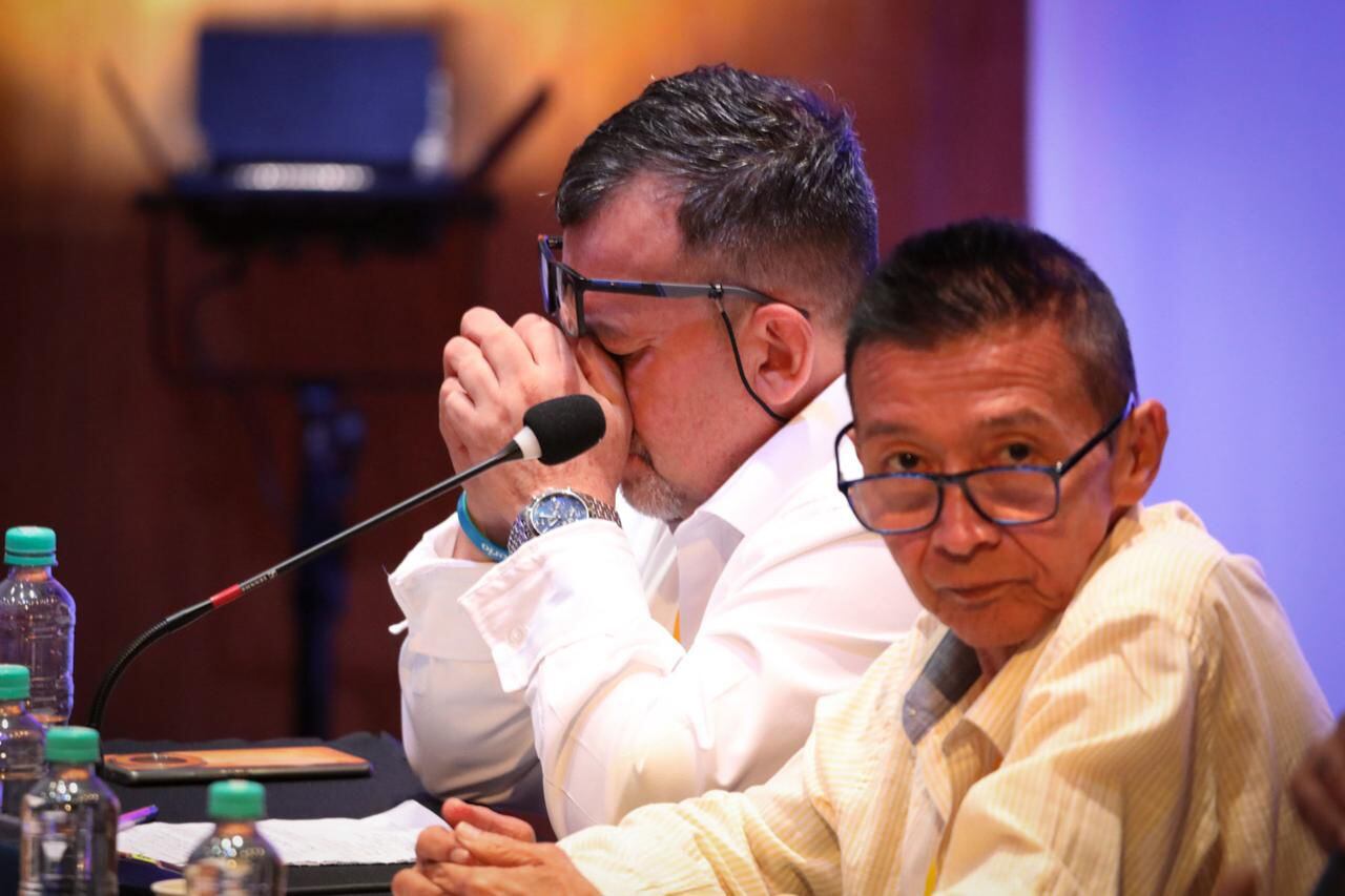 Gustavo Arbeláez limpiando sus lágrimas. A la derecha Edgar López "Pacho chino". Foto: JEP.
