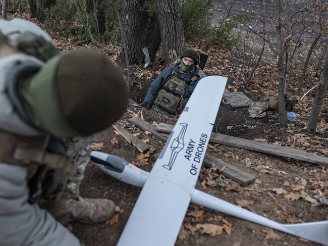 DONETSK OBLAST, UKRAINE - NOVEMBER 12: Ukrainian soldiers from the AZOV Brigade prepare a reconnaissance drone in the direction of Toretsk, Donetsk Oblast, Ukraine as Russia-Ukraine war continues. (Diego Herrera Carcedo/Anadolu via Getty Images) / Anadolu