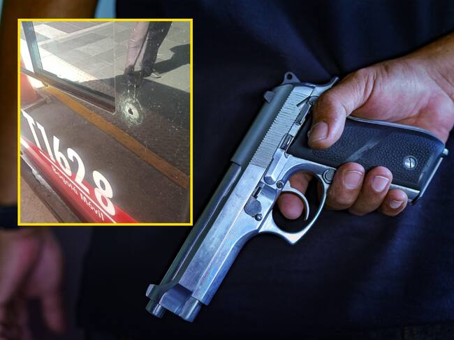 Imagen de referencia e impacto de bala en articulado de TransMilenio. Foto: Getty Images / Suministrada