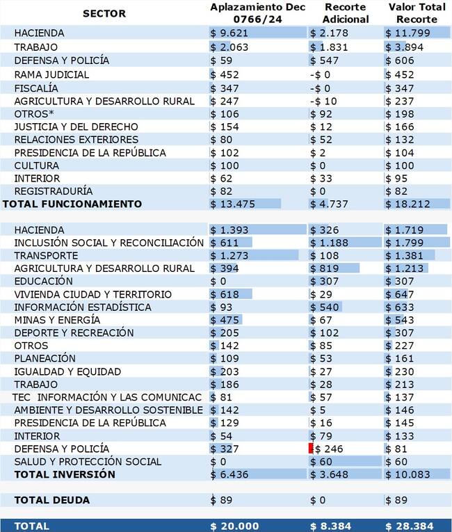 Con respecto a la inversión, se hará un recorte de $10,1 billones que estará liderado por el sector de Inclusión Social y Reconciliación con $1,8 billones, seguido de Hacienda con $1,7 billones, Transporte con $1,4 billones, Agricultura con $1,2 billones y Vivienda con $647.000 millones.