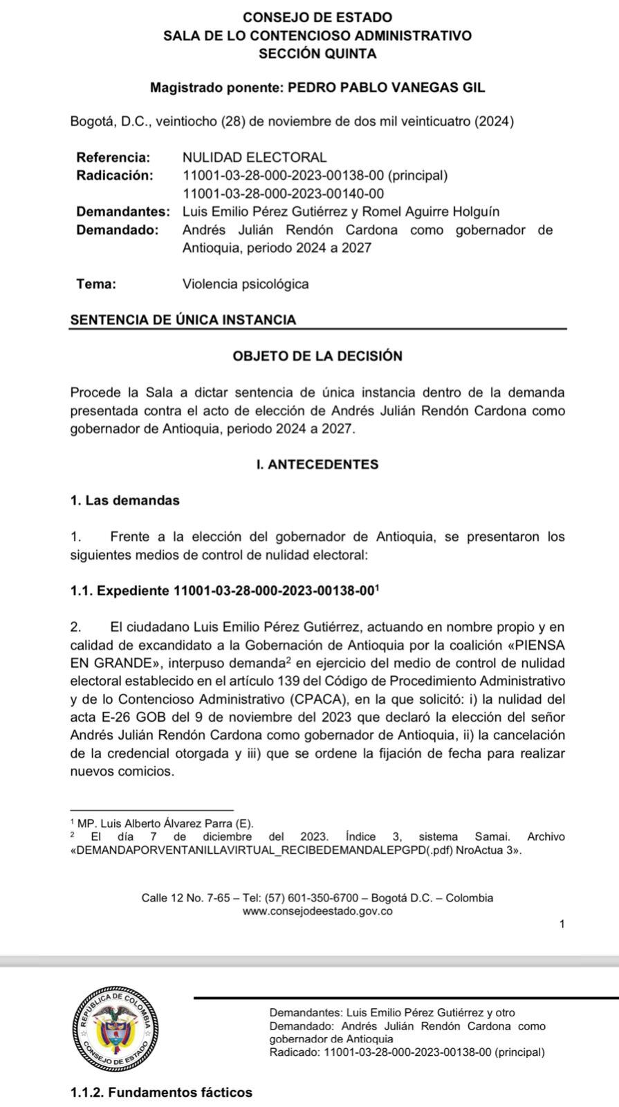 El Consejo de Estado rechazó la demanda de nulidad electoral presentada por el exgobernador Luis Pérez Gutiérrez en contra de la elección de Andrés Julián Rendón Cardona como gobernador de Antioquia para el periodo 2024-2027.