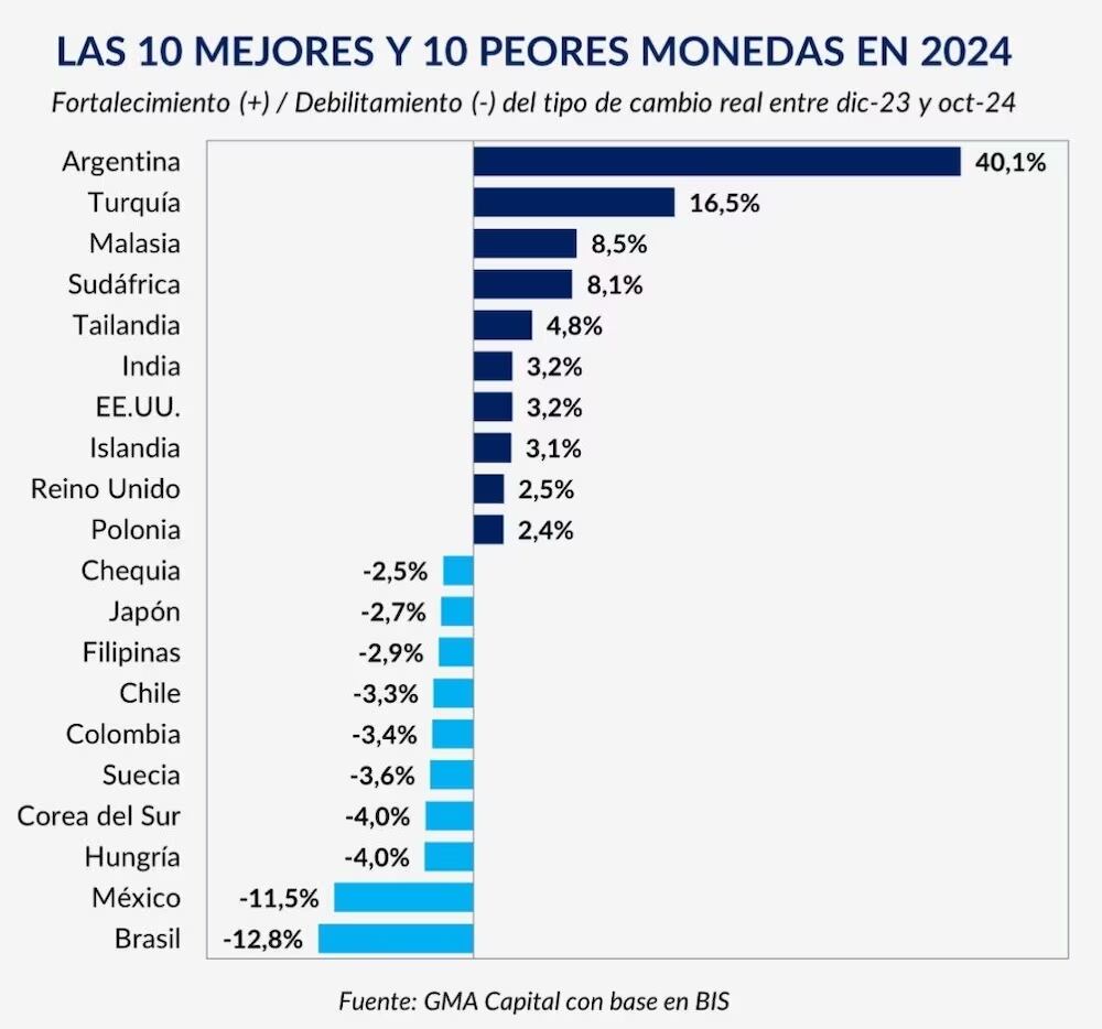 El peso argentino ocupa el primer puesto en el ranking mundial de apreciación de monedas durante los primeros diez meses del año, con un incremento del 40,1% según cálculos de GMA Capital que toma las estimaciones del Bank for International Settlements (BIS).