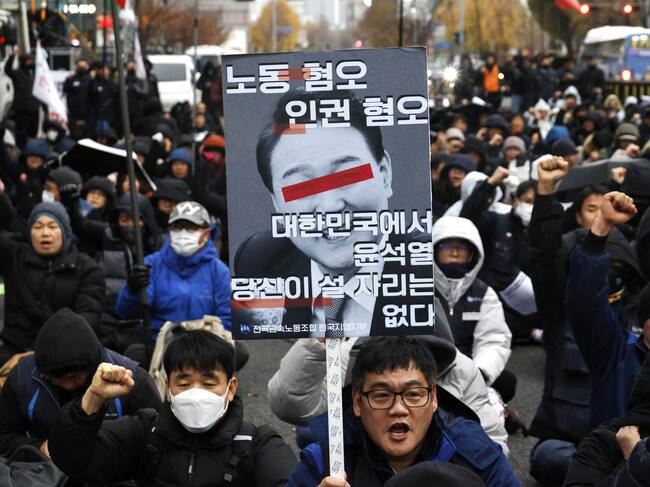 Seoul (Korea, Republic Of), 05/12/2024.- A Korean Confederation of Trade Unions (KCTU) member hold a placard reading 'Hatred of labor, human rights, there is no place for Yoon Sook Yeol in South Korea'. EFE/EPA/JEON HEON-KYUN / JEON HEON-KYUN (EFE)