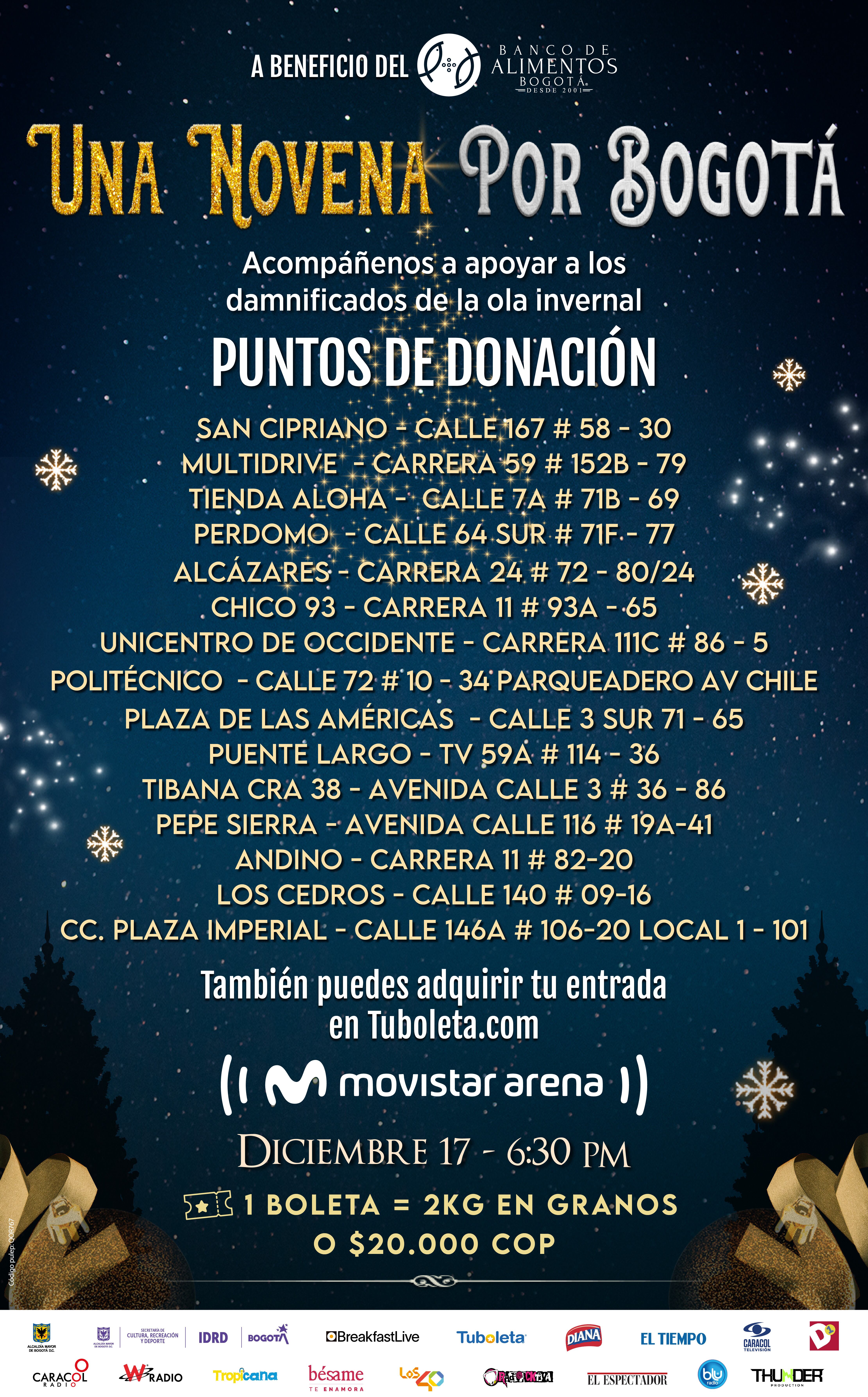 El próximo 17 de diciembre a las 6:30 de la tarde se llevará a cabo la tercera edición de ‘Una novena por Bogotá’, un evento del Movistar Arena y el Banco de Alimentos de Bogotá que combina la magia de la Navidad con el poder de la generosidad, convocando a los ciudadanos a apoyar a las familiares más vulnerables de la ciudad y a los damnificados por la ola invernal que afecta al país.