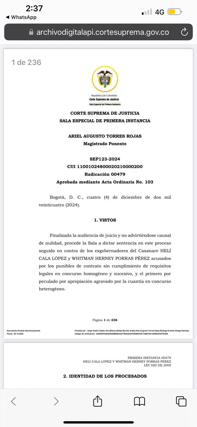 La Sala Especial de Primera Instancia de la Corte Suprema de Justicia condenó a los exgobernadores de Casanare Helí Cala López y Whitman Herney Porras Pérez