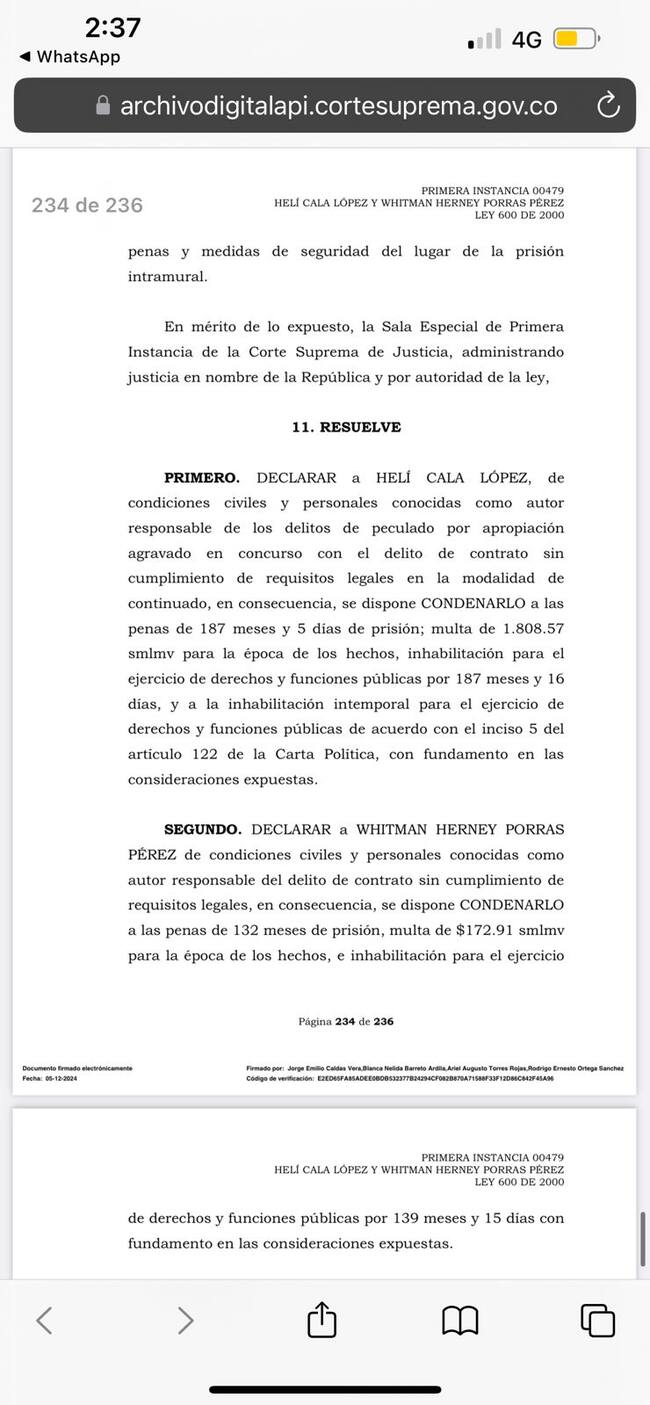 Por su parte, Whitman Herney Porras Pérez recibió una condena de 132 meses de prisión por contrato sin cumplimiento de requisitos legales en modalidad continuada.