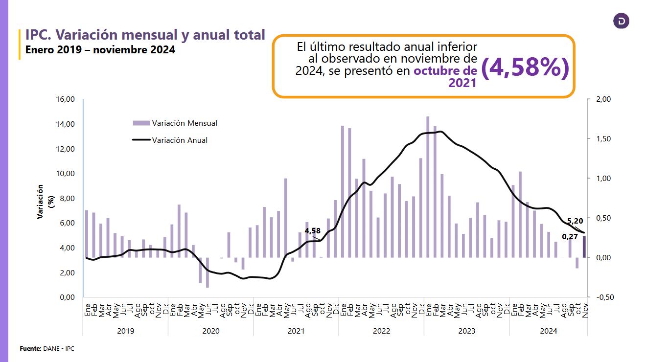 Al revisar la medición anual también hubo disminución, ubicándose en 5,20% cifra ampliamente menor a la que se registró en el mismo periodo anterior cuando había sido de 10,15%, allí el Dane aseguró que “el último resultado anual inferior al observado en noviembre de 2024 se presentó en noviembre de 2021 con 4,58%”; así las cosas, Piedad Urdinola, directora de la entidad manifestó que “nos vamos devolviendo en el tiempo, cada vez que revisamos cuando tuvimos una cifra similar”.