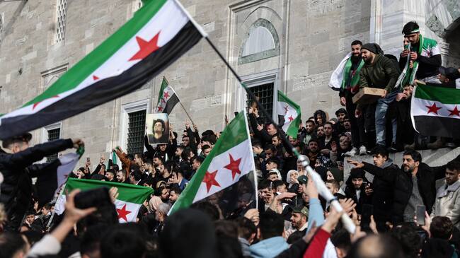 Istanbul (Turkey), 08/12/2024.- Supporters of the Syrian opposition residing in Turkey celebrate the rebel take over of Damascus at Fatih Mosque in Istanbul, Turkey, 08 December 2024. Syrian rebels entered Damascus on 08 December 2024 and announced in a televised statement the 'Liberation of the city of Damascus and the overthrow of Bashar al-Assad,' as well as the release of all the prisoners. The rebels also urged the Syrian armed forces to leave Syrian public institutions, which will stay under the control of the outgoing Syrian prime minister until the official handover ceremony. (Siria, Turquía, Damasco, Estanbul) EFE/EPA/ERDEM SAHIN / ERDEM SAHIN (EFE)