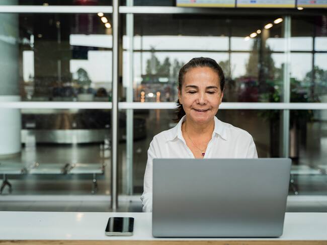 retrato de alta ejecutiva en el aeropuerto, con su portátil. / Rass Films