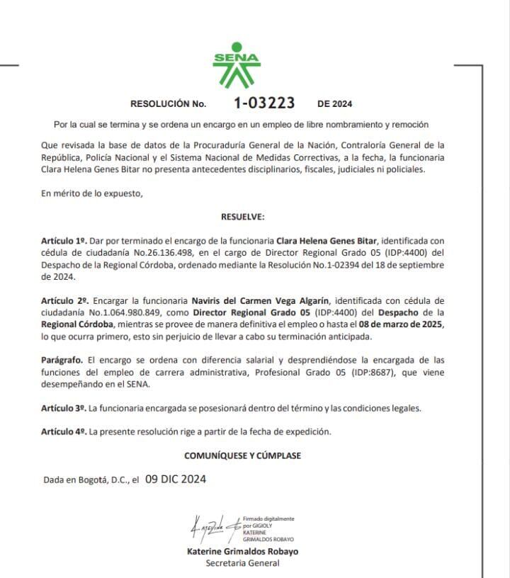 A través de un comunicado, el Servicio Nacional de Aprendizaje (SENA) Córdoba informó sobre la designación de Naviris del Carmen Vega Algarín como nueva directora regional encargada, según la Resolución 1-03223 de 2024 expedida por la Dirección General SENA, liderada por Jorge Londoño Ulloa.