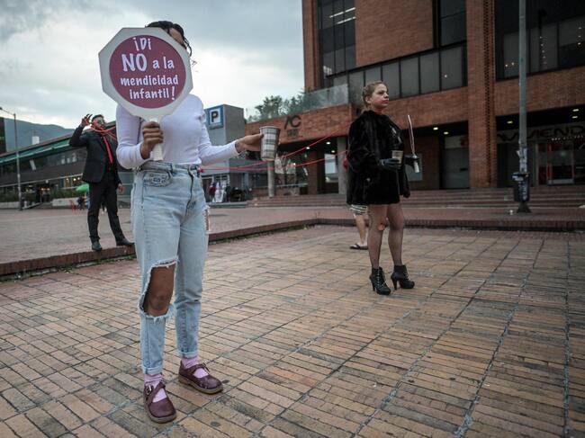 Miembros de la Secretaría Distrital de Seguridad realizan un performance contra la prostitución infantil y la trata de personas en Bogotá el 27 de abril de 2023. (Juan Barreto/AFP vía Getty Images) / JUAN BARRETO