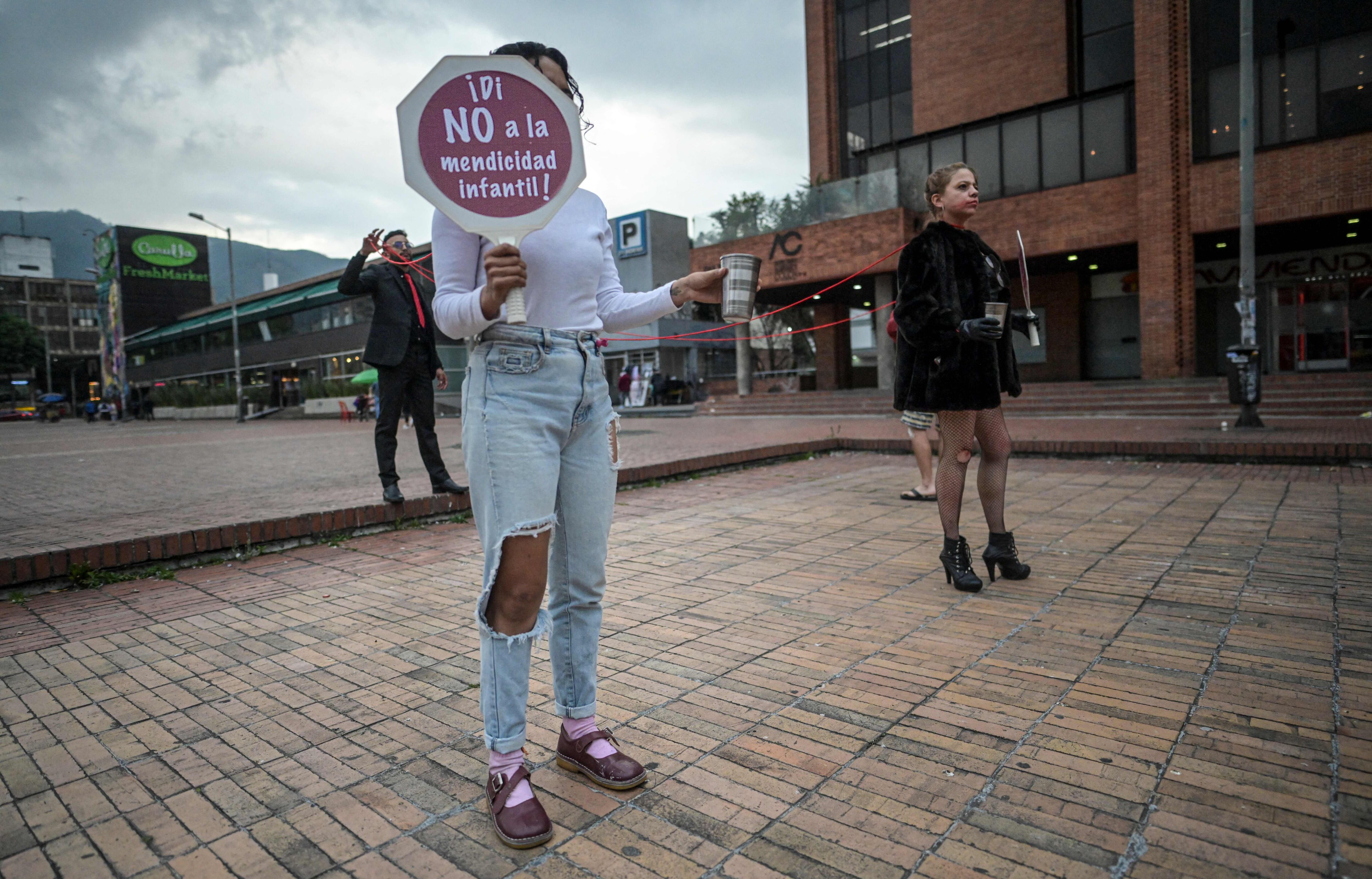 Miembros de la Secretaría Distrital de Seguridad realizan un performance contra la prostitución infantil y la trata de personas en Bogotá el 27 de abril de 2023. (Juan Barreto/AFP vía Getty Images) / JUAN BARRETO