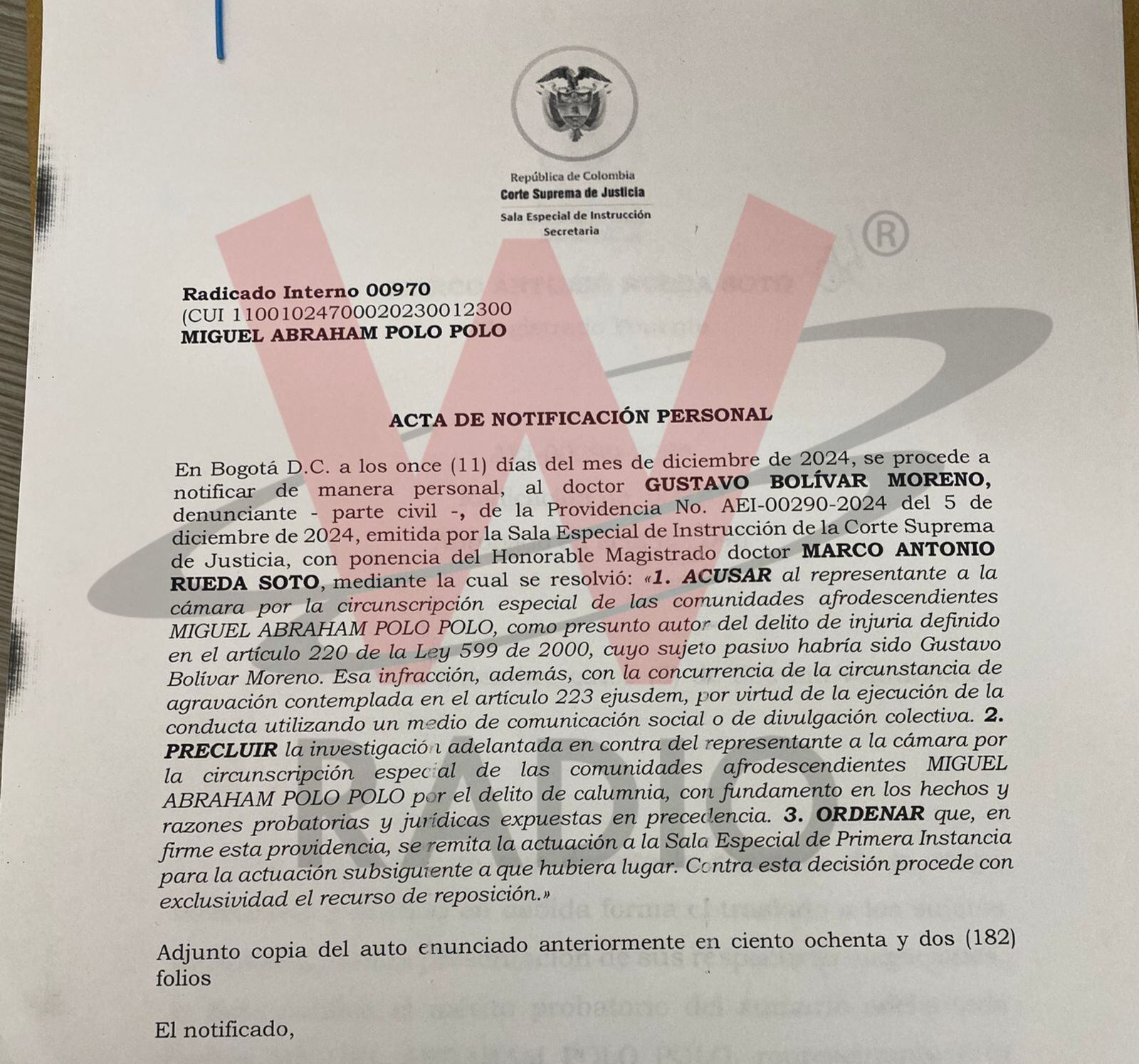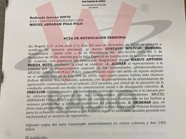 La W conoció una providencia con fecha 5 de diciembre de 2024 en la cual se resolvió acusar al congresista por cuenta de sus declaraciones en contra del funcionario, con lo cual será juzgado ante el alto tribunal. Sin embargo, la investigación por calumnia fue cerrada.