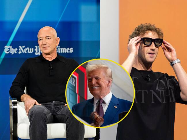 Jeff Bezos, CEO de Amazon (Eugene Gologursky/Getty Images); Mark Zuckerberg, CEO de Meta (Andrej Sokolow/picture alliance vía Getty Images), y Donald Trump, presidente electo de Estados Unidos (Spencer Platt/Getty Images)