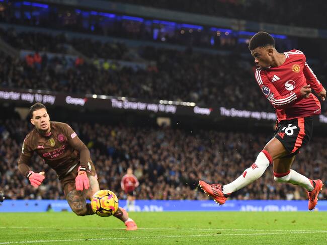 Manchester (United Kingdom), 14/12/2024.- Manchester United's Amad Diallo (R) scores the 1-2 lead against Manchester City's goalkeeper Ederson (L) during the English Premier League soccer match between Manchester City and Manchester United, in Manchester, Britain, 15 December 2024. (Reino Unido) EFE/EPA/PETER POWELL / PETER POWELL (EFE)