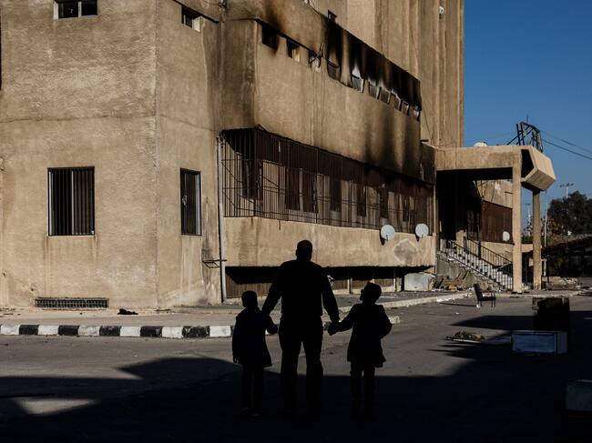 Damascus (Syrian Arab Republic), 18/12/2024.- A man walks with two children outside the Palestine's Station Prison, headquarters of the Syrian secret services. EFE/EPA/ANTONIO PEDRO SANTOS / ANTONIO PEDRO SANTOS (EFE)
