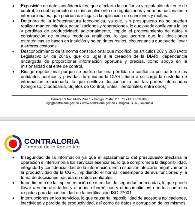 “De darse el aplazamiento, la CGR vería reducida su capacidad para evaluar el cumplimiento de las políticas públicas de manera efectiva. La falta de recursos afectaría el desarrollo de actividades claves para monitorear el progreso de las políticas y su impacto en la sociedad. Esto dificultaría la supervisión adecuada de los resultados de los programas gubernamentales, limitando la capacidad de identificar si se están cumpliendo los objetivos establecidos. Sin los recursos necesarios, la CGR no podría realizar las actuaciones de manera oportuna, lo que comprometería la efectividad del control y la transparencia en la ejecución de los recursos públicos”, se lee en la carta.