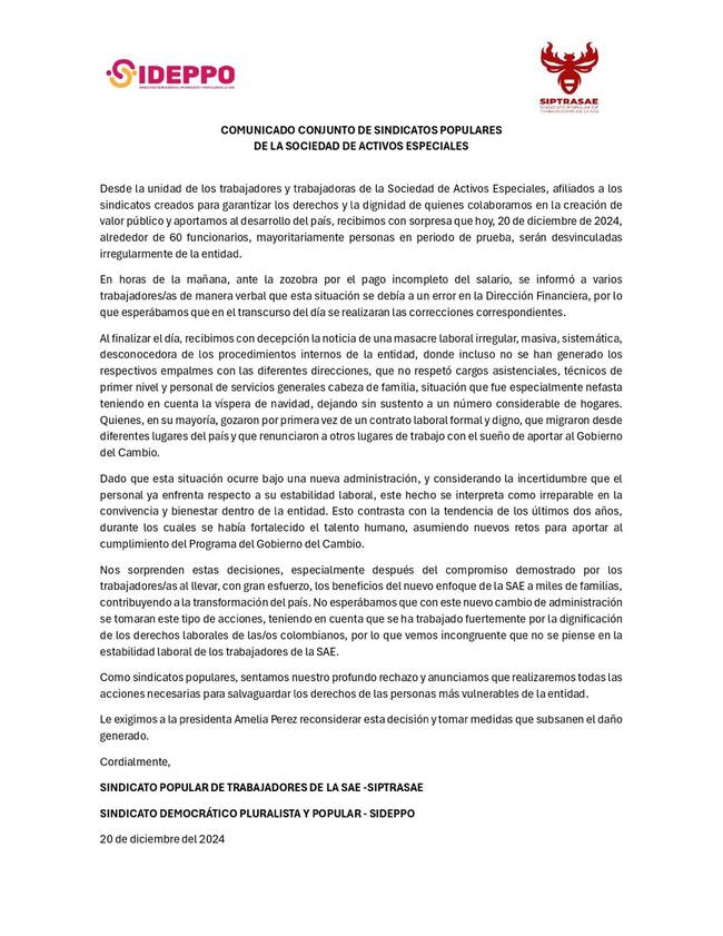 En una carta, dos sindicatos de la Sociedad de Activos Especiales (SAE) expresaron su inconformidad porque “alrededor de 60 funcionarios, mayoritariamente personas en periodo de prueba, serán desvinculadas irregularmente de la entidad”.