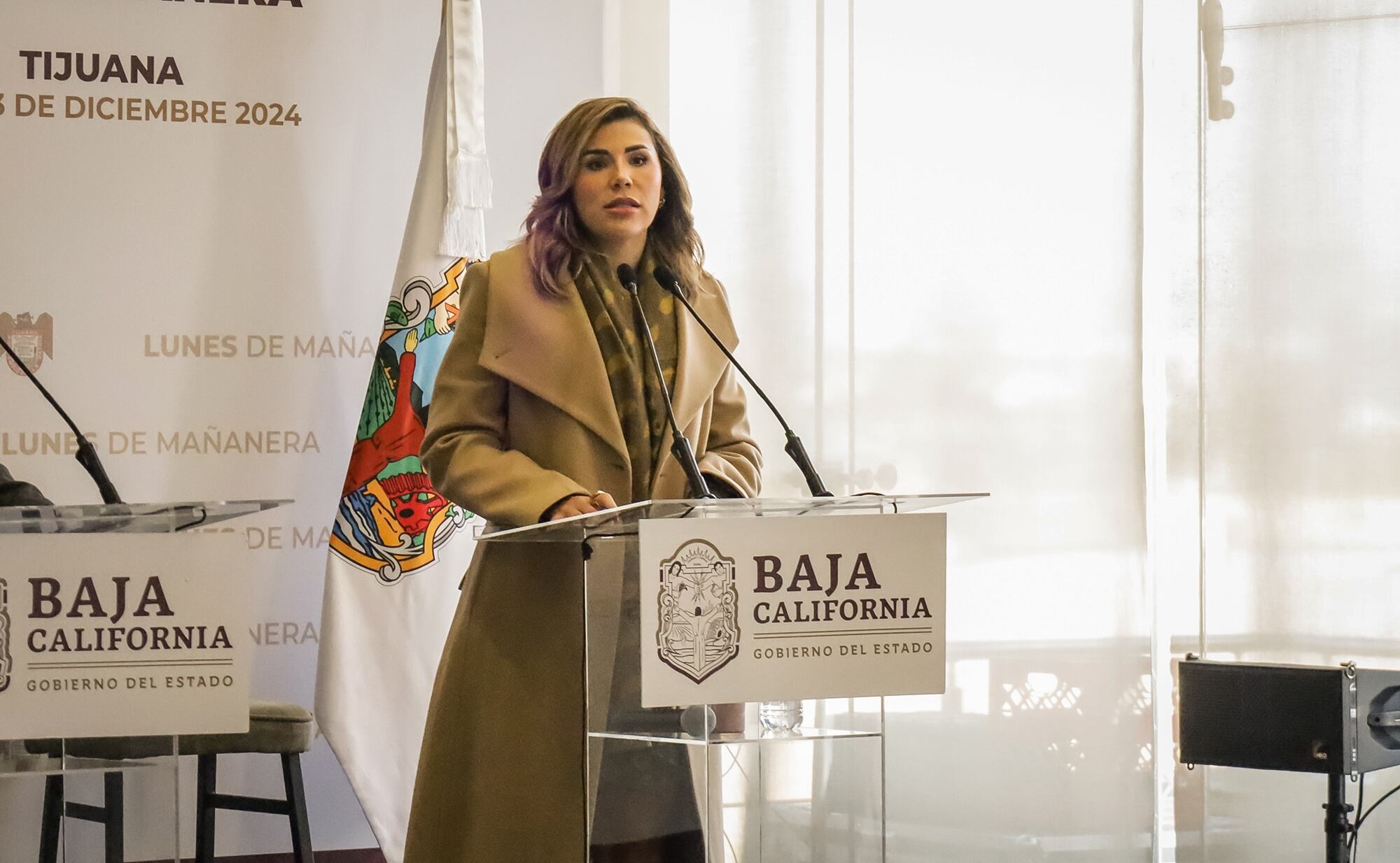 TIJUANA (MÉXICO), 23/12/2024.- La gobernadora del estado mexicano de Baja California, Marina del Pilar Ávila, habla durante una rueda de prensa. EFE/ Joebeth Terriquez / Joebeth Terriquez