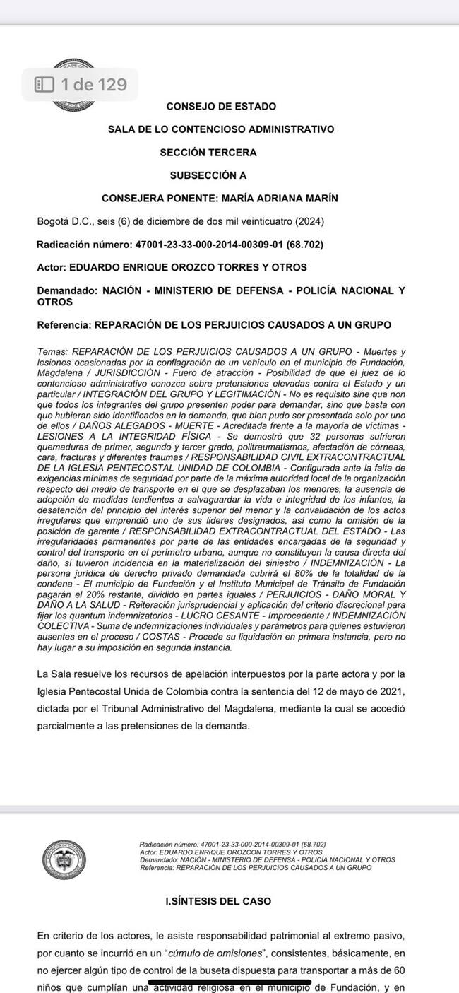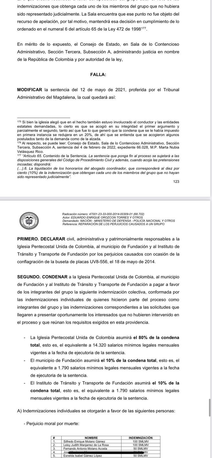 En 2021, ya se había condenado a la Iglesia Pentecostal a pagar 36.000 millones de pesos como indemnización por los decesos y lesiones ocasionados por esta tragedia. Sin embargo, la decisión fue apelada por la institución religiosa. Finalmente, a finales de 2024, el Consejo de Estado emitió una resolución definitiva.