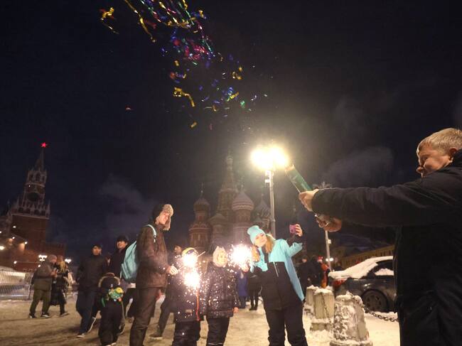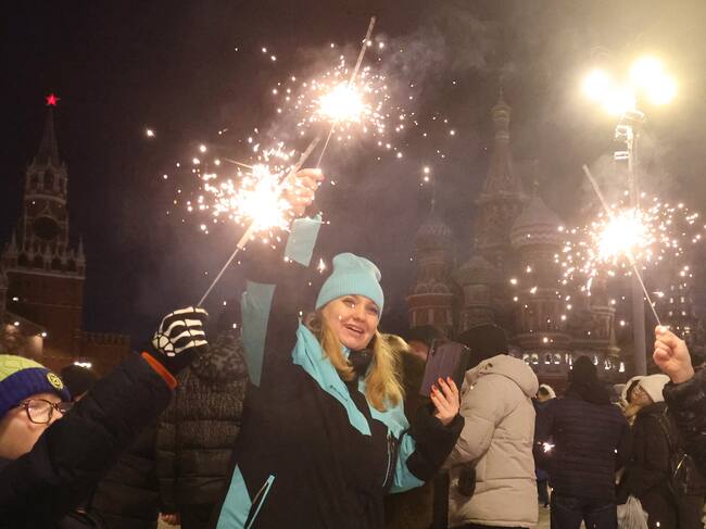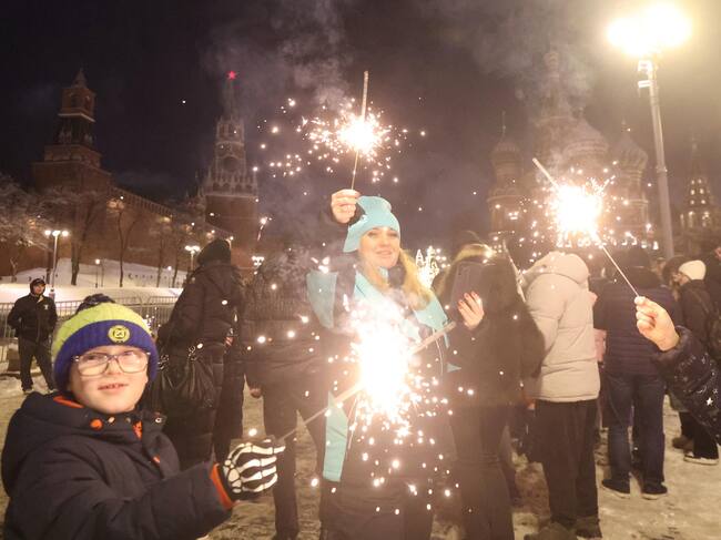 Moscow (Russian Federation), 31/12/2024.- People celebrate the New Year outside the Kremlin in Moscow, Russia, 01 January 2025. (Rusia, Moscú) EFE/EPA/MAXIM SHIPENKOV / MAXIM SHIPENKOV