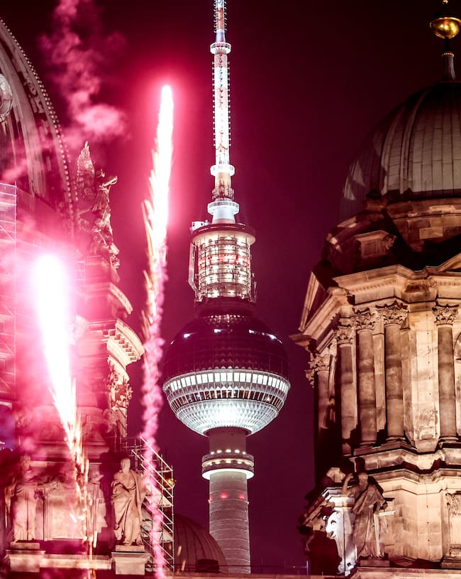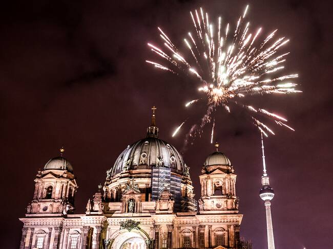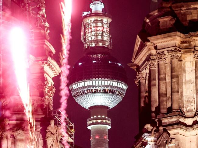Berlin (Germany), 31/12/2024.- Fireworks illuminate the sky over Berlin TV Tower and Berliner Dom during New Year's Eve celebrations in Berlin, Germany, 31 December 2024. (Alemania) EFE/EPA/FILIP SINGER / FILIP SINGER