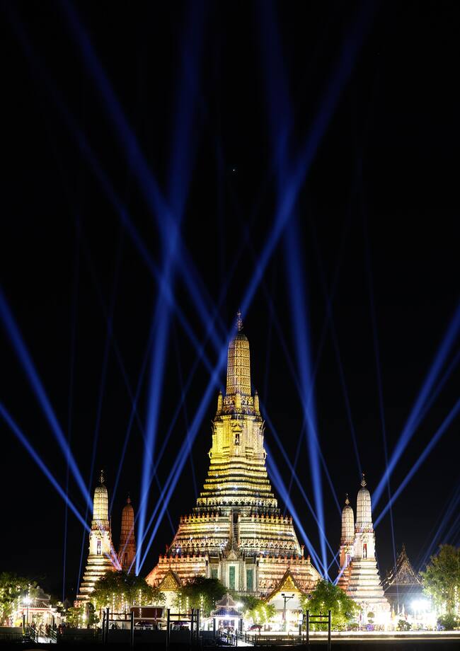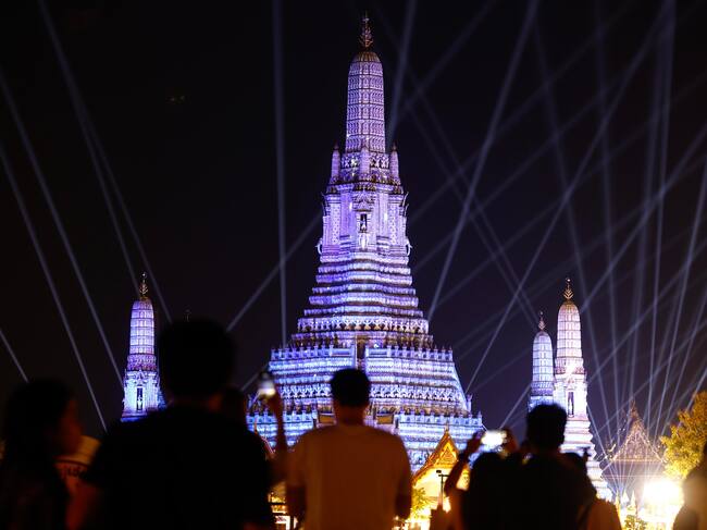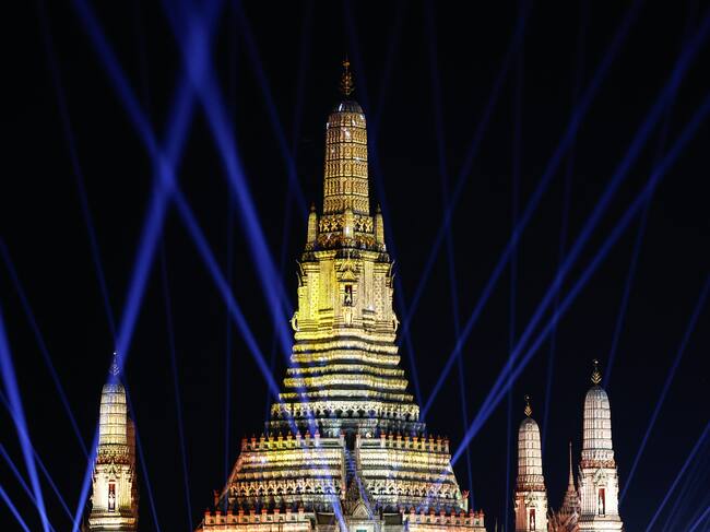 Bangkok (Thailand), 31/12/2024.- The pagoda of the Temple of Dawn or Wat Arun, is illuminated during a light show as part of New Year's Eve celebrations, in Bangkok, Thailand, 31 December 2024. (Tailandia) EFE/EPA/NARONG SANGNAK / NARONG SANGNAK