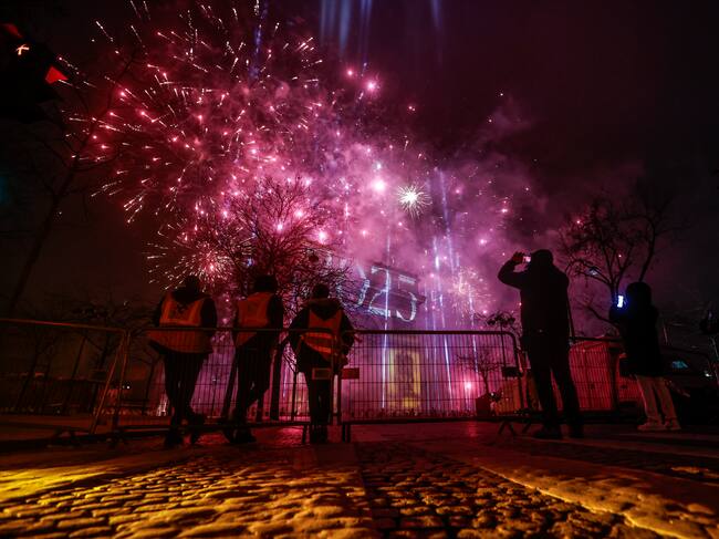 Warsaw (Poland), 01/01/2025.- Spectators watch a fireworks show prepared to welcome the New Year, on the Cwil's Mound in Warsaw, Poland, 01 January 2025. (Polonia, Varsovia) EFE/EPA/Leszek Szymanski POLAND OUT / Leszek Szymanski