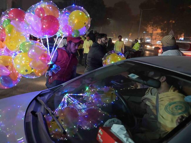 Lahore (Pakistan), 01/01/2025.- A man sells balloons on a street as people celebrate the New Year's Eve in Lahore, Pakistan, 01 January 2025. EFE/EPA/A. HUSSAIN / A. HUSSAIN