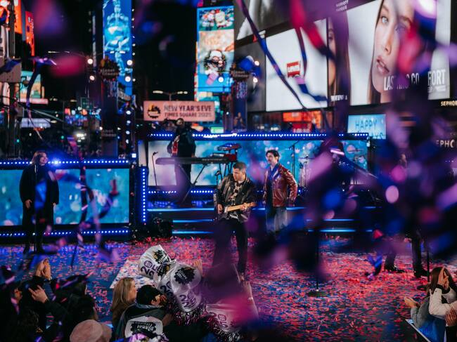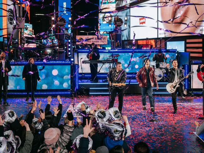 New York (United States), 01/01/2025.- American pop band Jonas Brothers performs ahead of the annual ball drop as revelers gather to celebrate the new year in Times Square on New Year's Eve in New York, New York, USA, 31 December 2024. (Nueva York) EFE/EPA/OLGA FEDEROVA / OLGA FEDEROVA