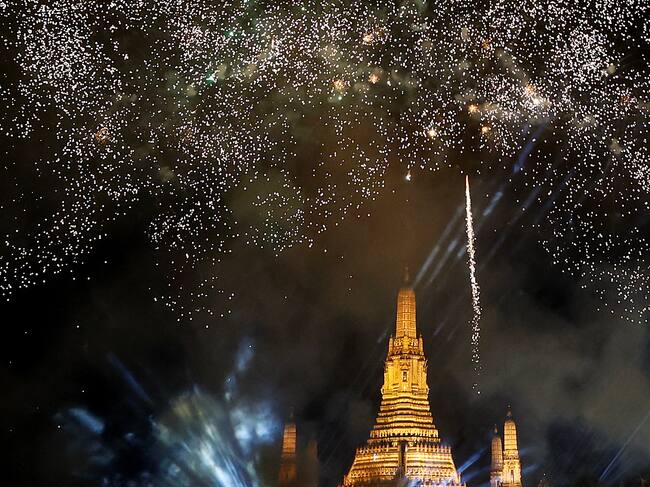 Bangkok (Thailand), 01/01/2025.- Fireworks and lights illuminate the sky over the pagoda of the Temple of Dawn or Wat Arun, as part of New Year's celebrations, in Bangkok, Thailand, 01 January 2025. (Tailandia) EFE/EPA/NARONG SANGNAK / NARONG SANGNAK