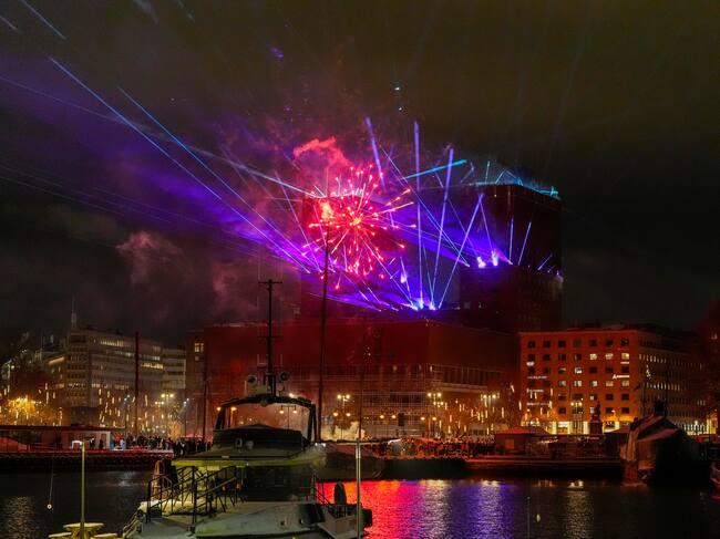 Oslo (Norway), 31/12/2024.- A laser light show from city hall illuminates the sky to welcome the new year in Oslo, Norway, 01 January 2025. (Noruega) EFE/EPA/LISE ASERUD NORWAY OUT / LISE ASERUD