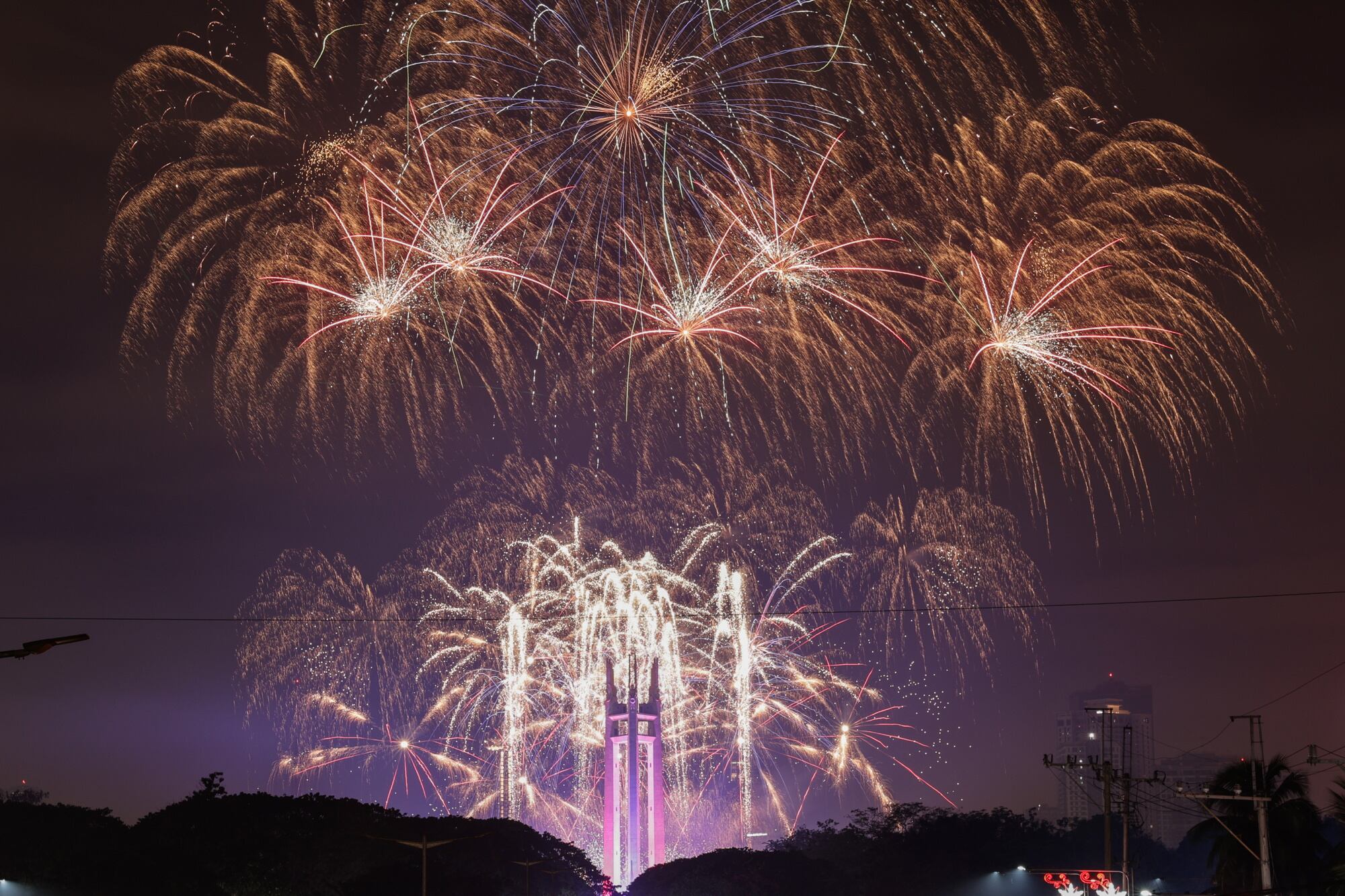 Quezon City (Philippines), 01/01/2025.- A fireworks display marks the New Year above the Memorial Circle of Quezon City, Metro Manila, Philippines, 01 January 2025. Revelers in the Philippines welcomed the new year, with many opting to come out of their homes to watch fireworks displays supervised by local government units. (Filipinas) EFE/EPA/ROLEX DELA PENA / ROLEX DELA PENA