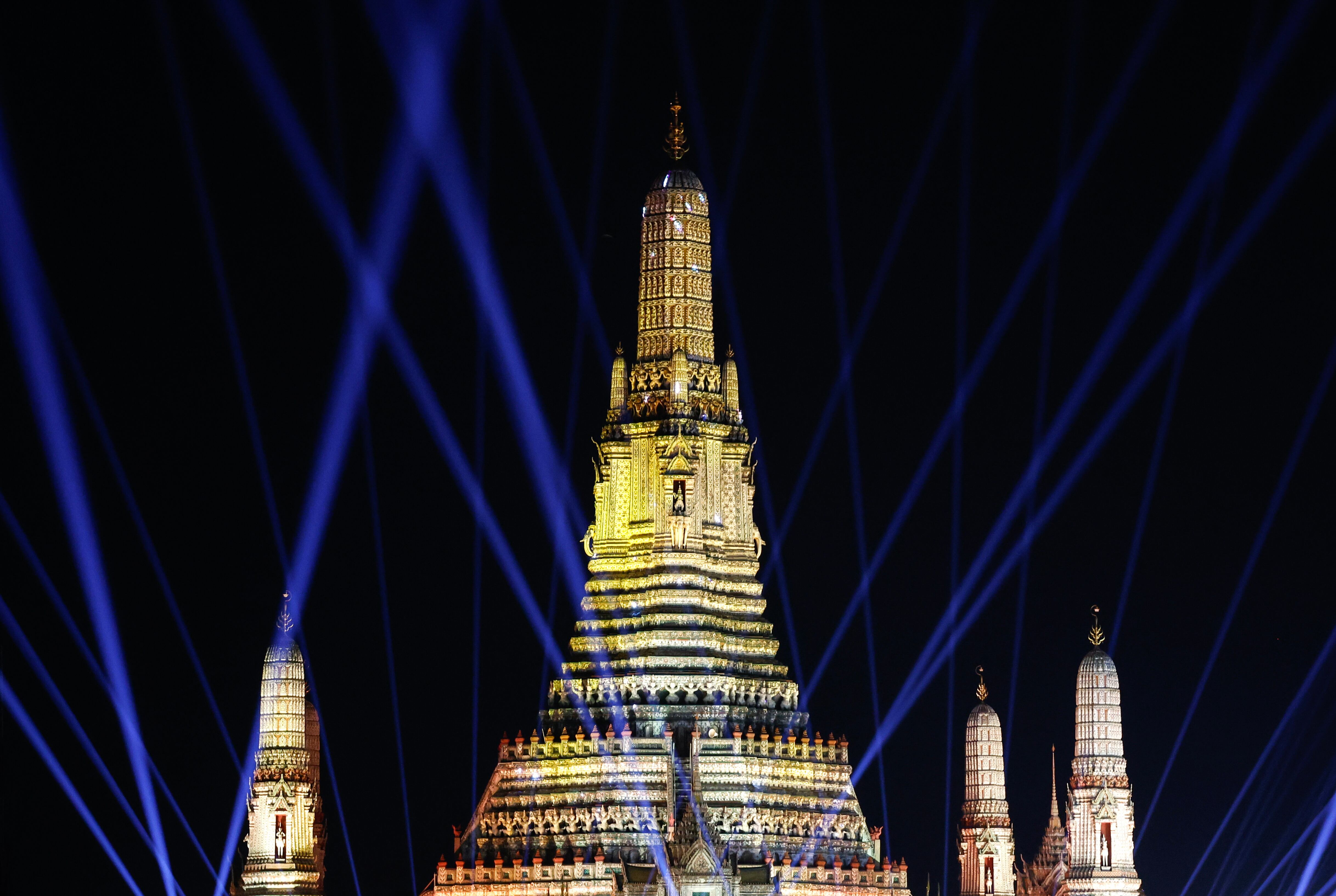Bangkok (Thailand), 31/12/2024.- The pagoda of the Temple of Dawn or Wat Arun, is illuminated during a light show as part of New Year's Eve celebrations, in Bangkok, Thailand, 31 December 2024. (Tailandia) EFE/EPA/NARONG SANGNAK / NARONG SANGNAK