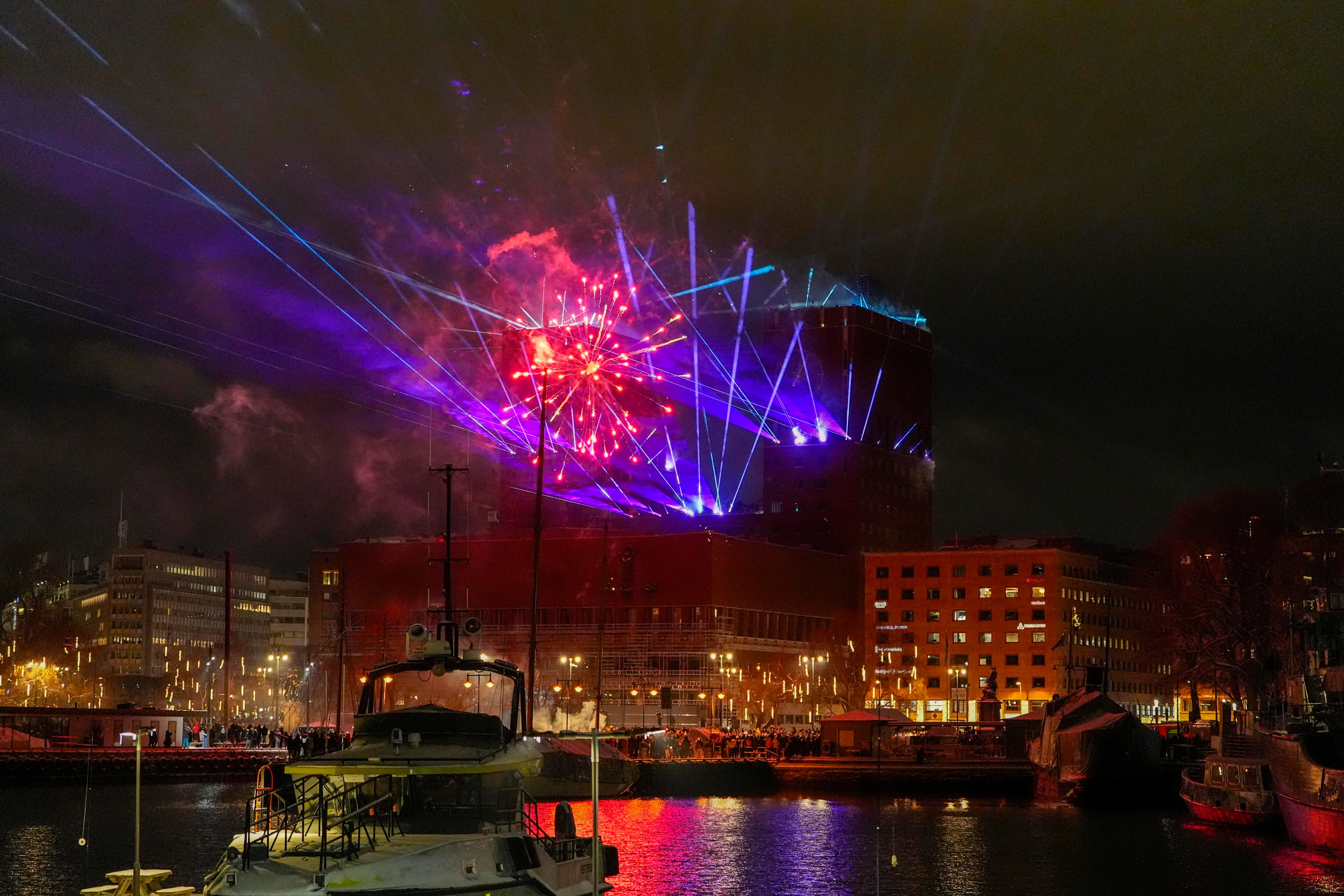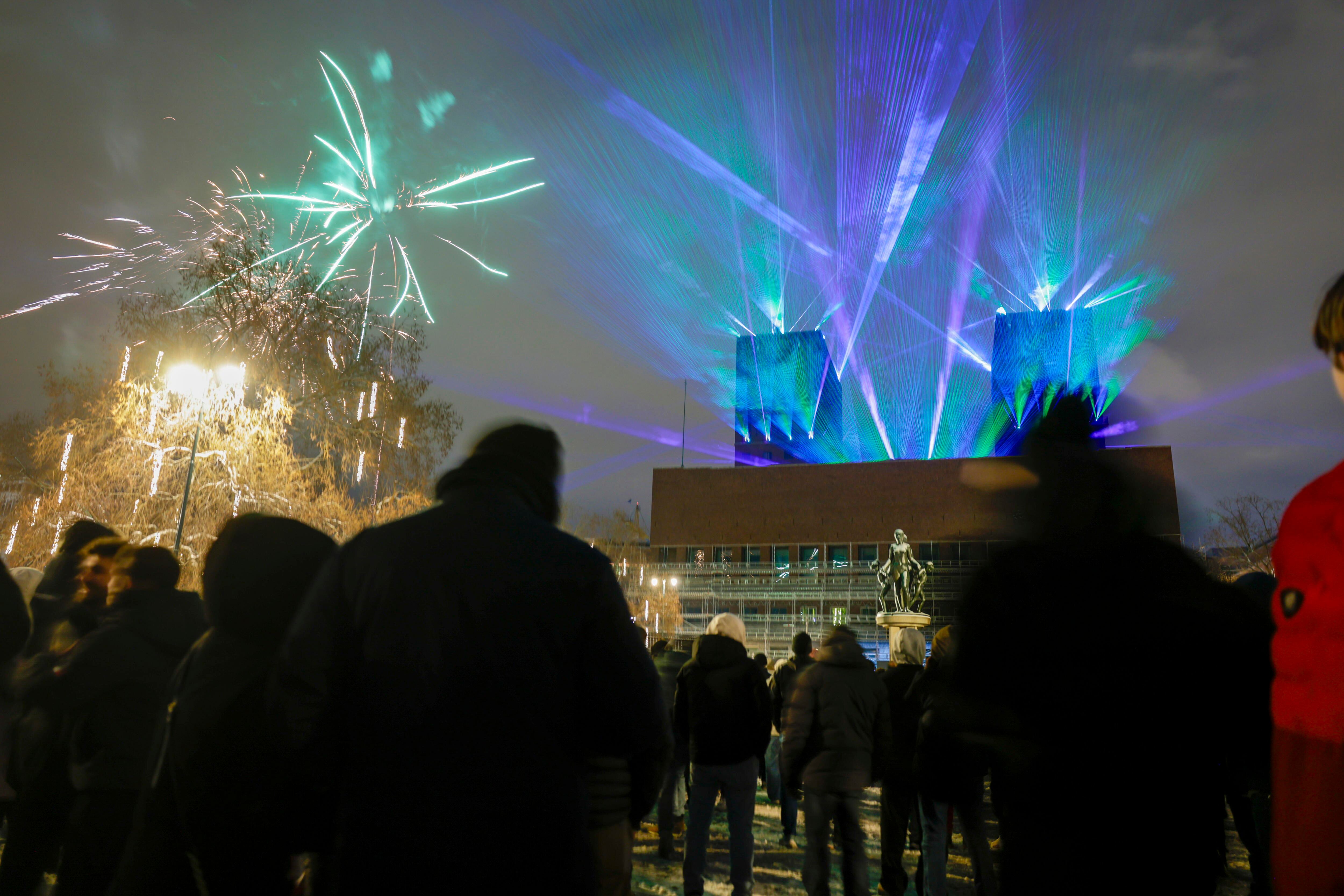 Oslo (Norway), 31/12/2024.- A laser light show from city hall illuminates the sky to welcome the new year in Oslo, Norway, 01 January 2025. (Noruega) EFE/EPA/LISE ASERUD NORWAY OUT / LISE ASERUD