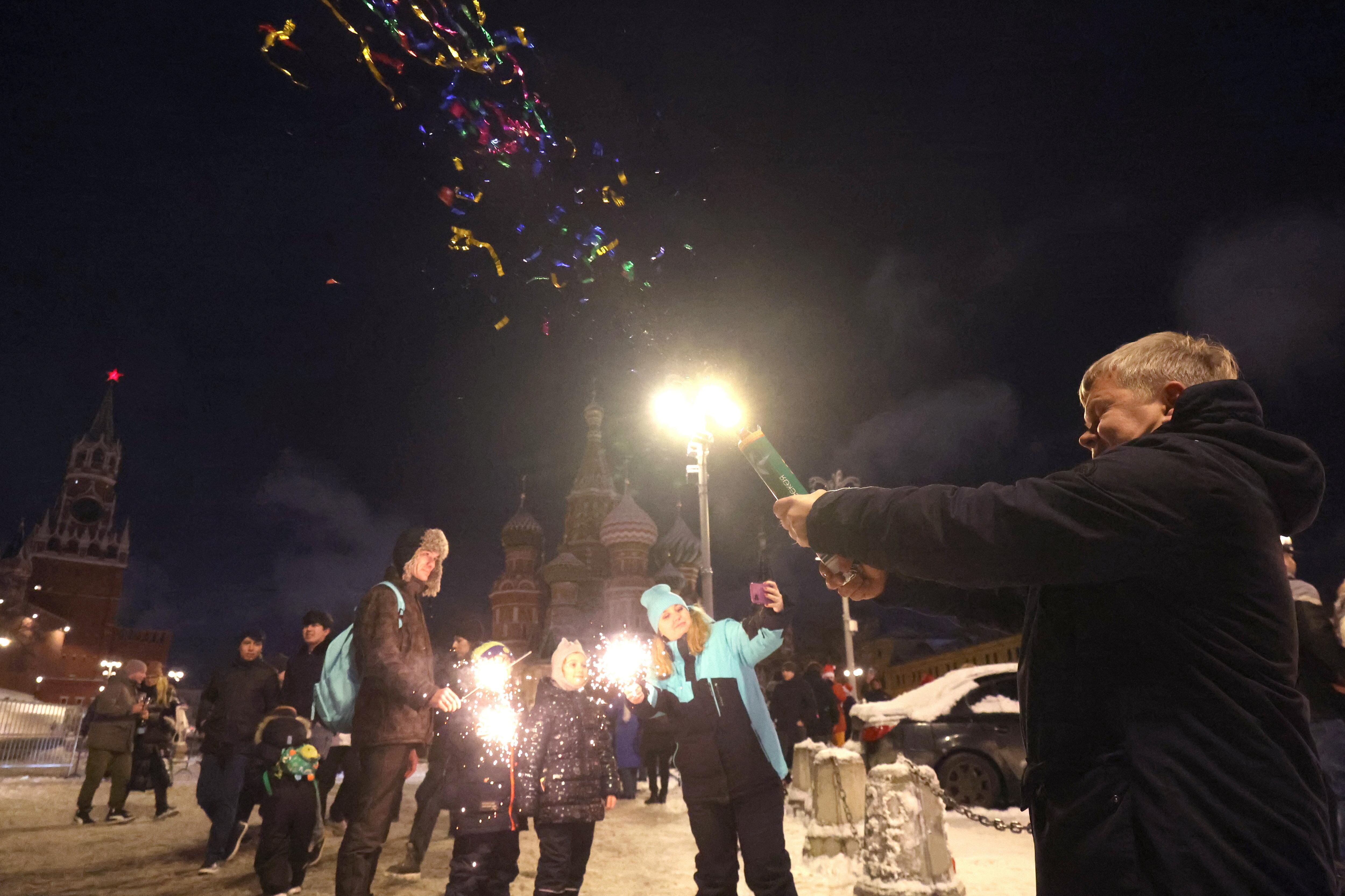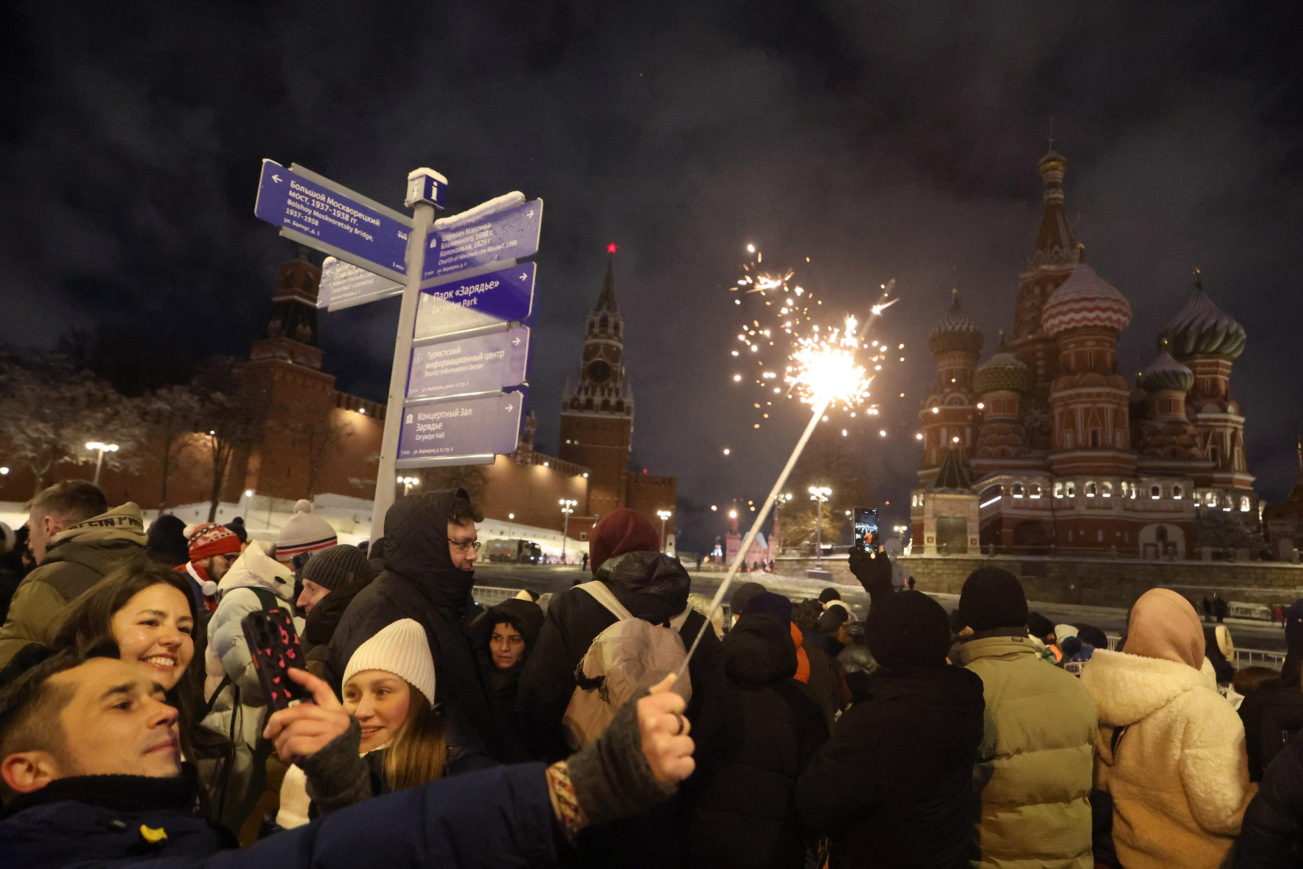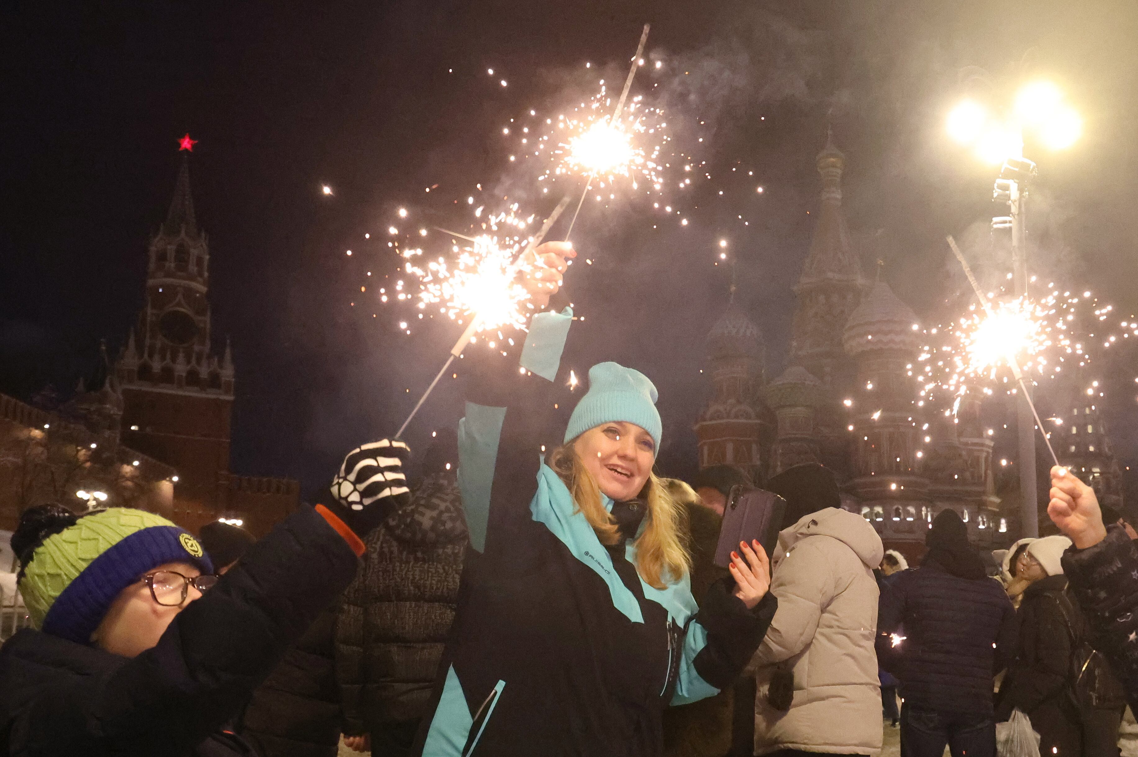Moscow (Russian Federation), 31/12/2024.- People celebrate the New Year outside the Kremlin in Moscow, Russia, 01 January 2025. (Rusia, Moscú) EFE/EPA/MAXIM SHIPENKOV / MAXIM SHIPENKOV