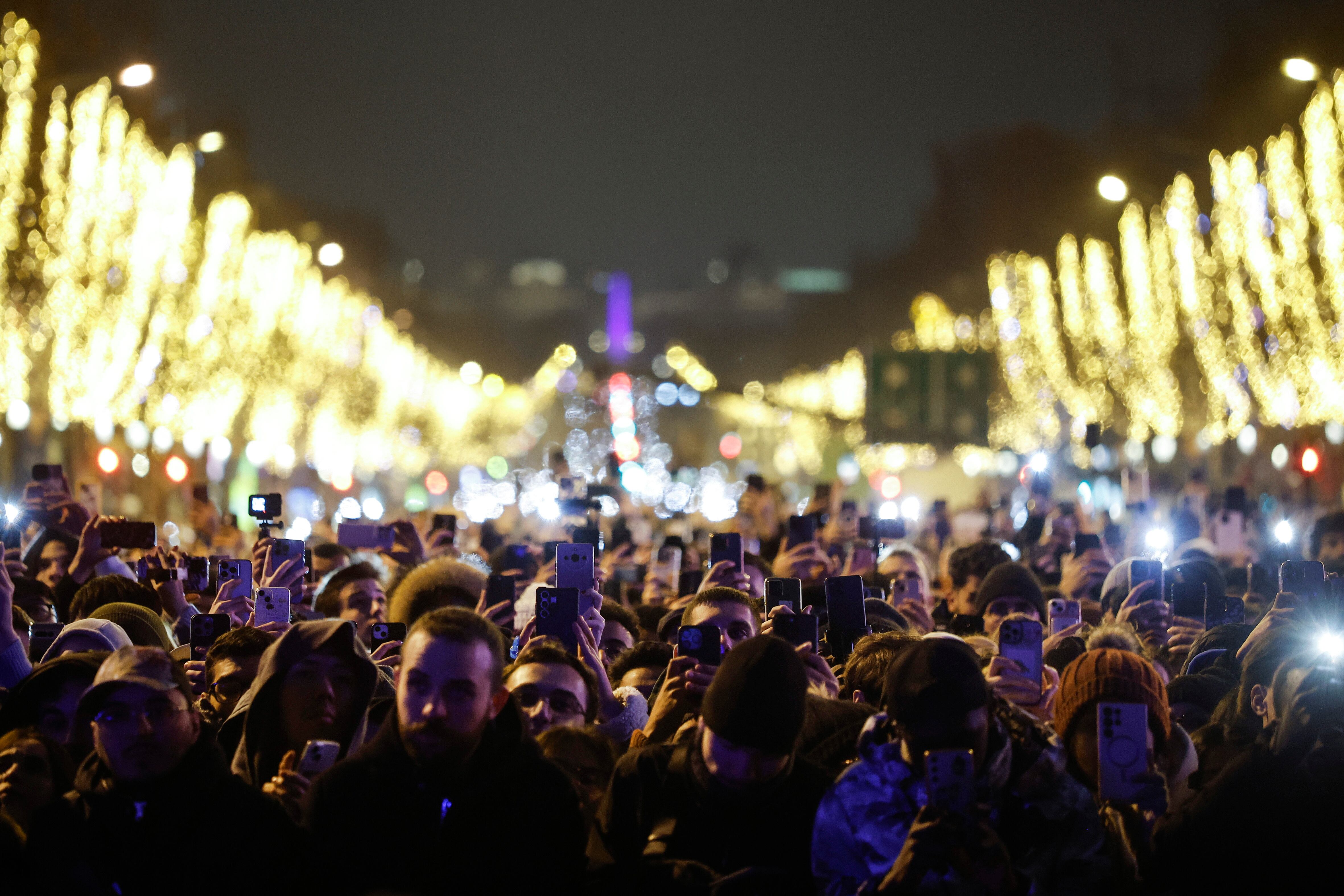 Paris (France), 31/12/2024.- Thousands of spectators stand on the Champs Elysee as fireworks illuminate the sky over the The Arc of Triomphe during the New Year's celebrations in Paris, France, 01 January 2025. (Francia) EFE/EPA/YOAN VALAT / YOAN VALAT